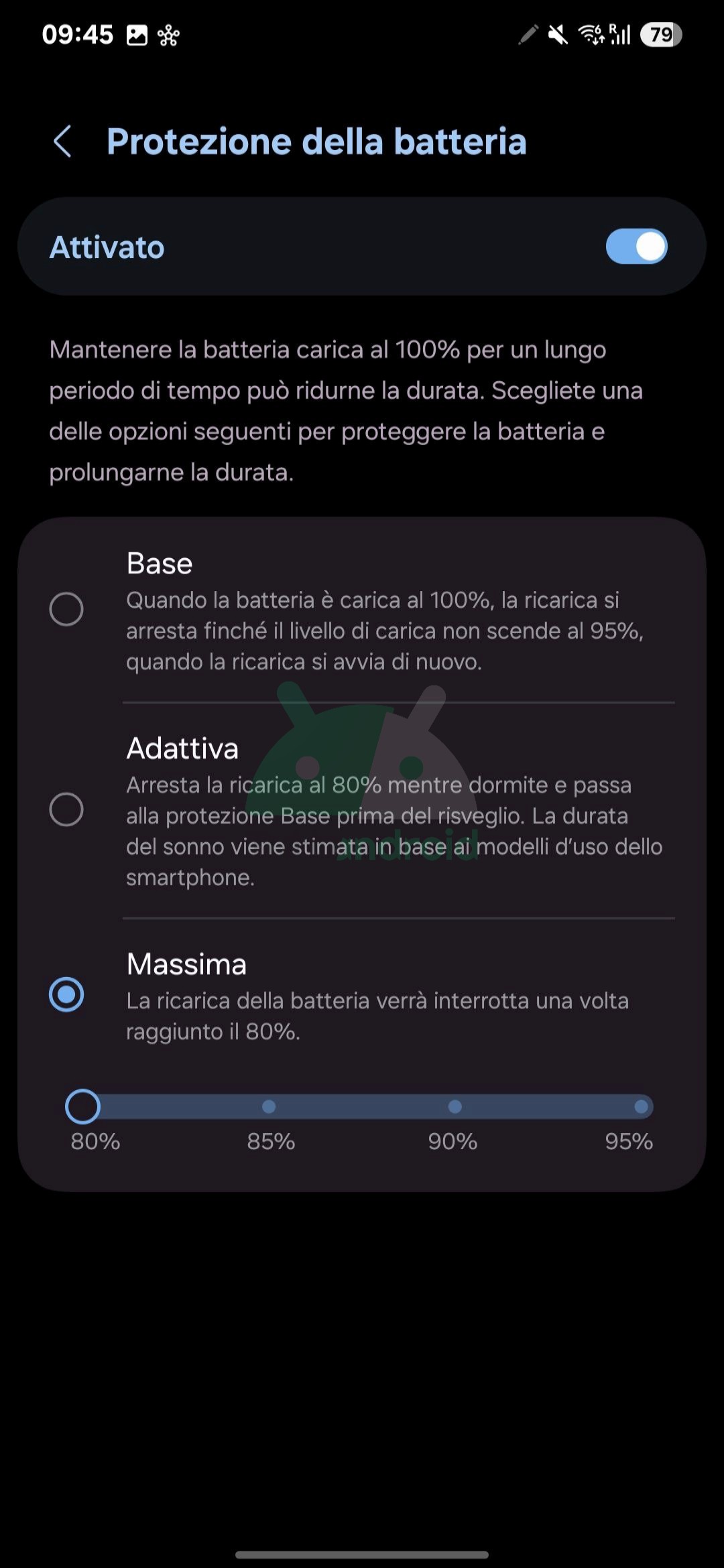 Attualmente la modalità Massima interrompe la ricarica all’80%, ma con la One UI 7 è possibile scegliere con maggiore precisione questo intervallo: si può optare per l’80%, per l’85%, per il 90% o per il 95%, in modo da scegliere il giusto equilibrio tra necessità e preservamento della batteria.