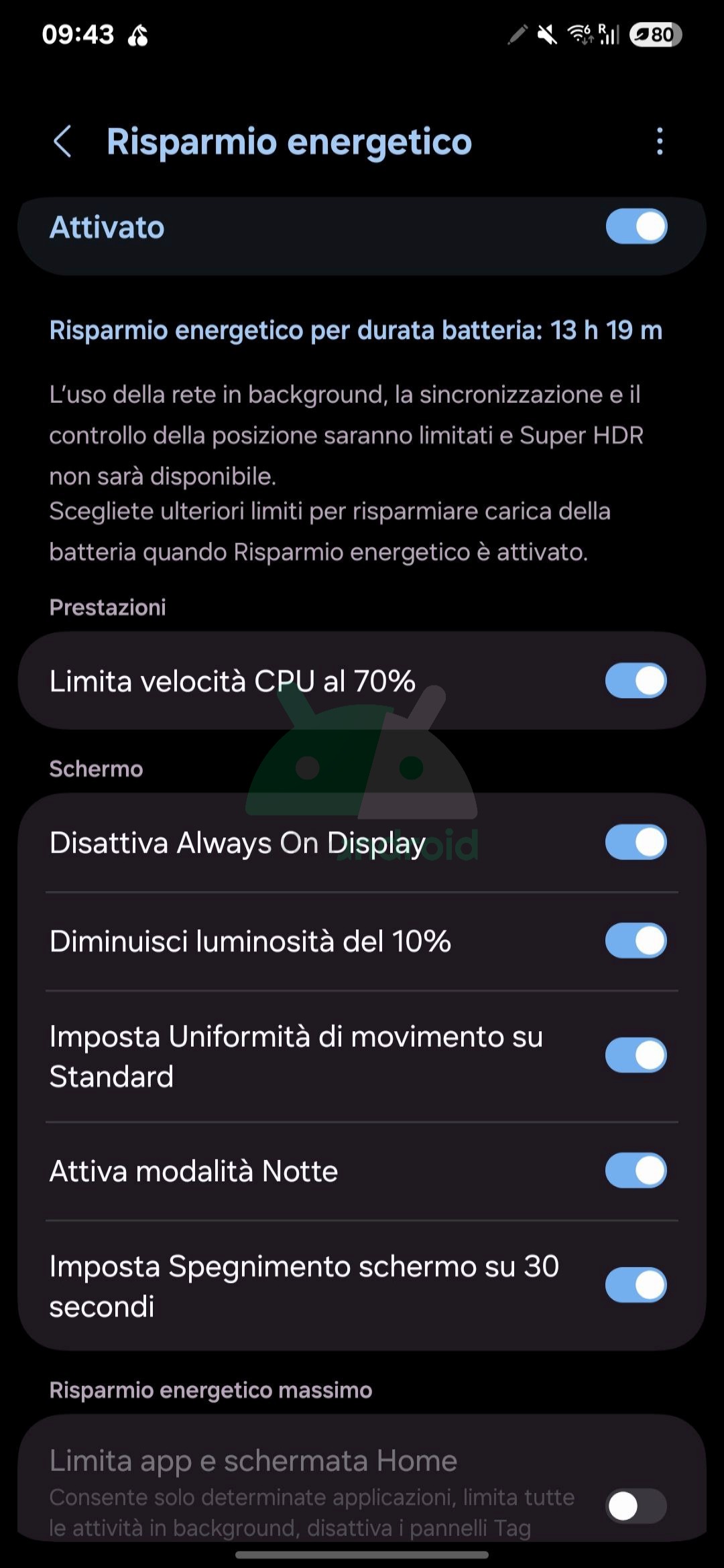La seconda novità resta in questo ambito (“Impostazioni > Batteria“), ma si trova nella sezione “Risparmio energetico“: attualmente è possibile personalizzare alcuni dettagli della modalità risparmio energetico attraverso i toggle (come “Disattiva Always On Display“, “Limita velocità CPU al 70%” o “Diminuisci luminosità del 10%“), ma solo prima di attivarla. Sulla One UI 7 si possono invece modificare anche una volta attivata, per una maggiore flessibilità. In più, si aggiungono ulteriori opzioni.