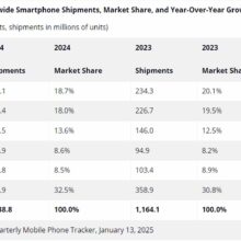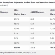 I dati mostrano anche Transsion (che include itel Mobile, Infinix Mobile e Tecno Mobile) che ha mantenuto la quarta posizione con un tasso di crescita del 12,7% alla pari con Vivo per il quarto trimestre dello scorso anno e con OPPO nel confronto per tutto il 2024.