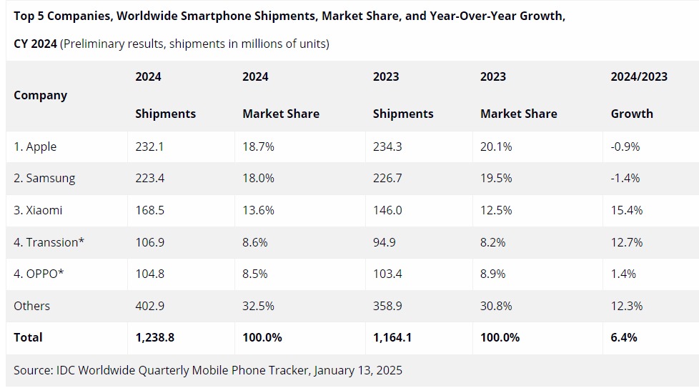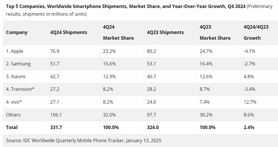 I dati mostrano anche Transsion (che include itel Mobile, Infinix Mobile e Tecno Mobile) che ha mantenuto la quarta posizione con un tasso di crescita del 12,7% alla pari con Vivo per il quarto trimestre dello scorso anno e con OPPO nel confronto per tutto il 2024.