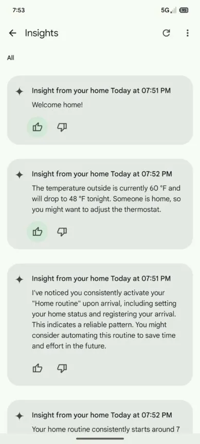 Con questa funzionalità Google Home fornirà suggerimenti personalizzati e feedback sulla qualità delle indicazioni fornite. Sembra infatti che attivando questa funzionalità Google Home analizzi l’interazione con i dispositivi della propria casa intelligente così da fornire consigli utili per migliorare l’esperienza d’uso (come suggerimenti per ottimizzare il consumo energetico o nuove automazioni).