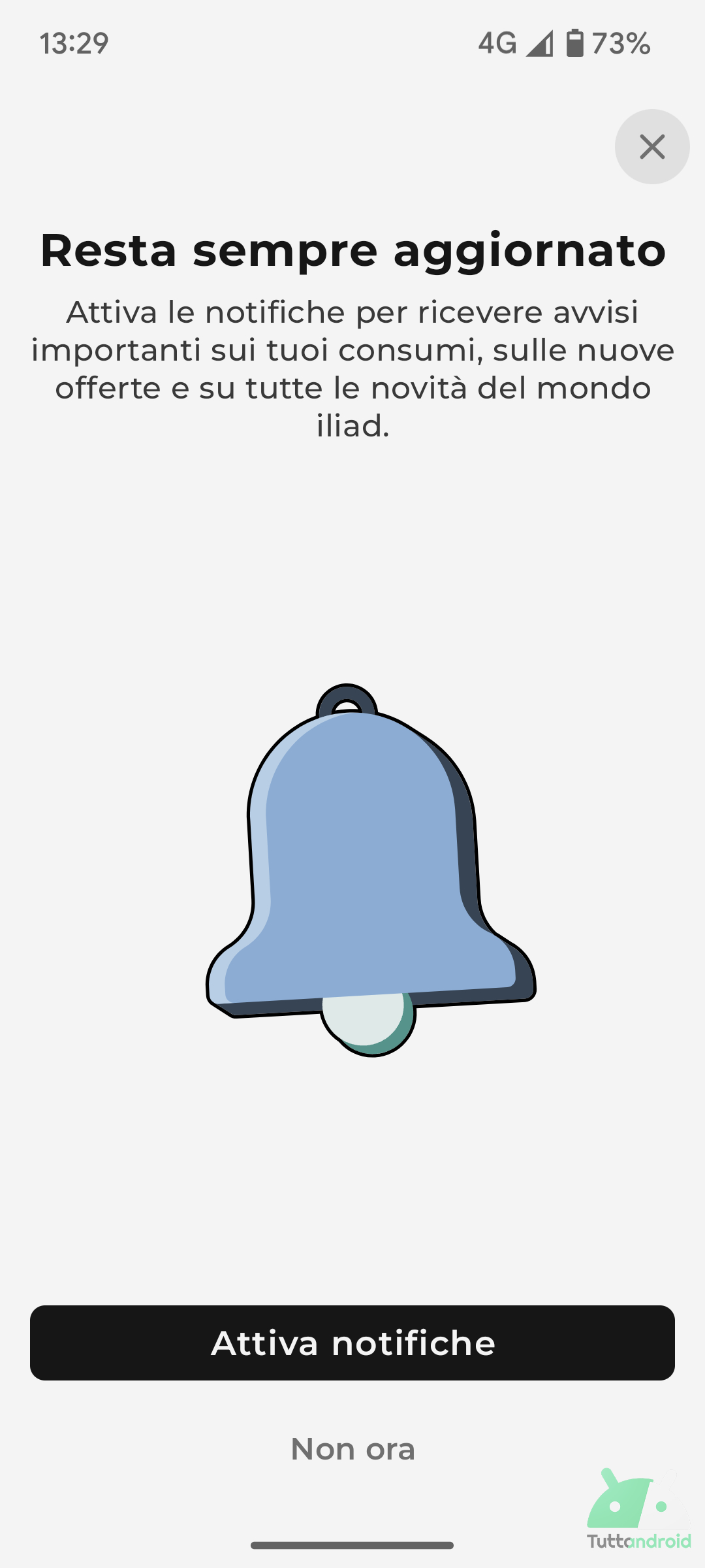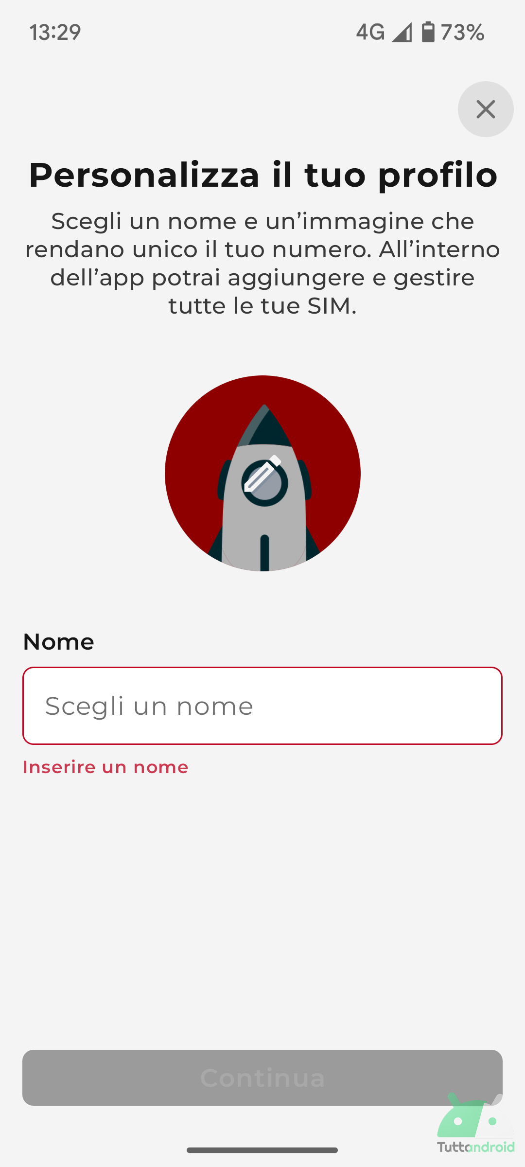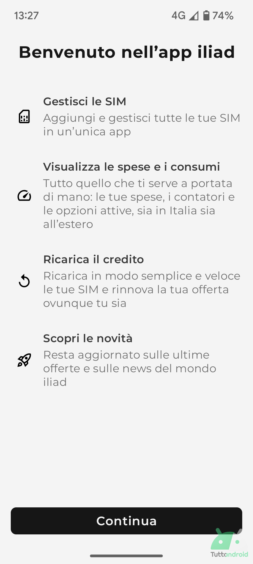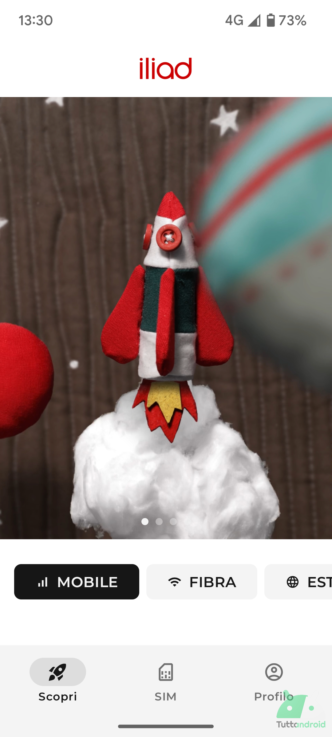 Alla prima apertura della nuova appa Iliad, verrà proposta una schermata di benvenuto, seguita da una transizione (con un razzo che viene lanciato) che anticipa la schermata di login.