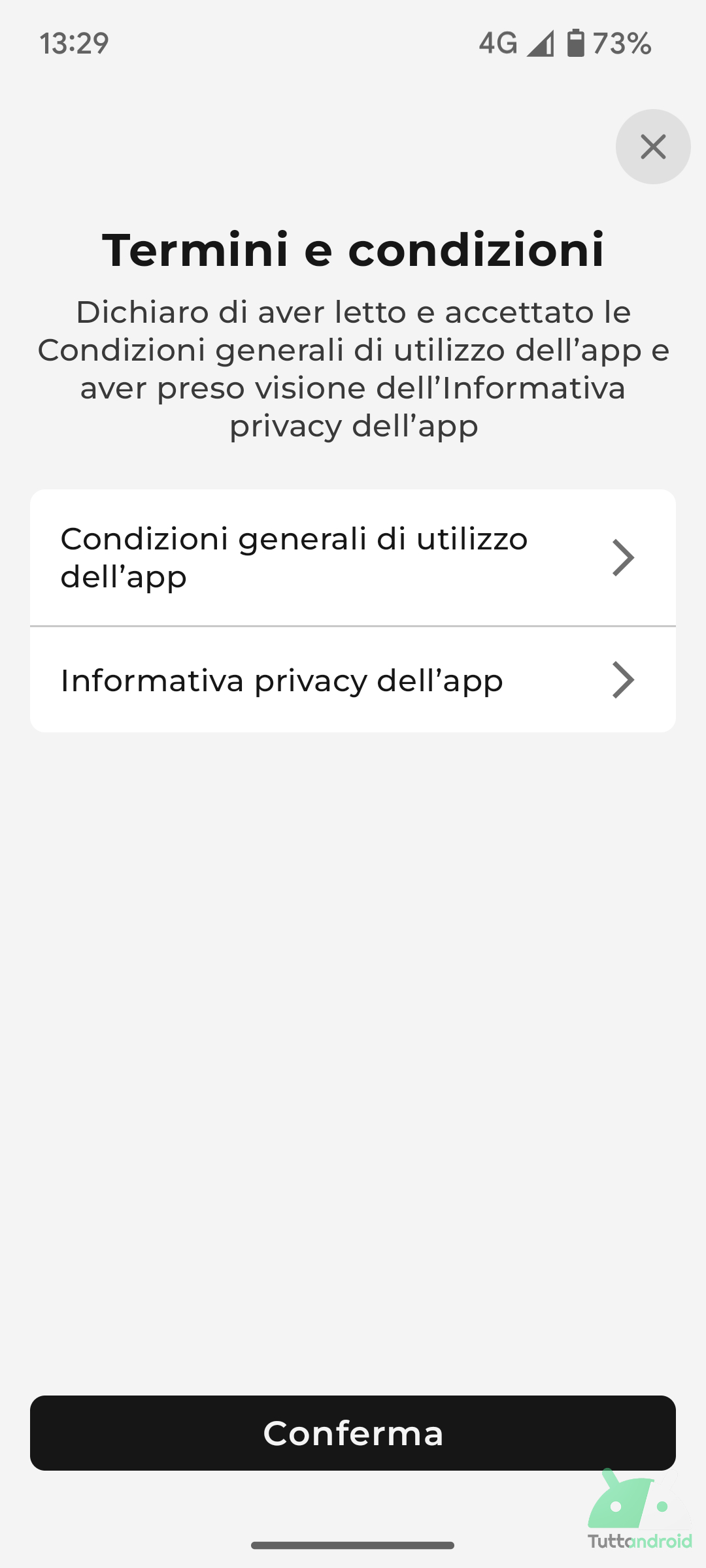 A questo punto, basterà inserire le credenziali di accesso (le stesse con cui siamo registrati all’area personale) prima di effettuare un tap su “Accedi”; la schermata successiva, chiederà di accettare Termini e condizioni (condizioni generali di utilizzo e informativa privacy).