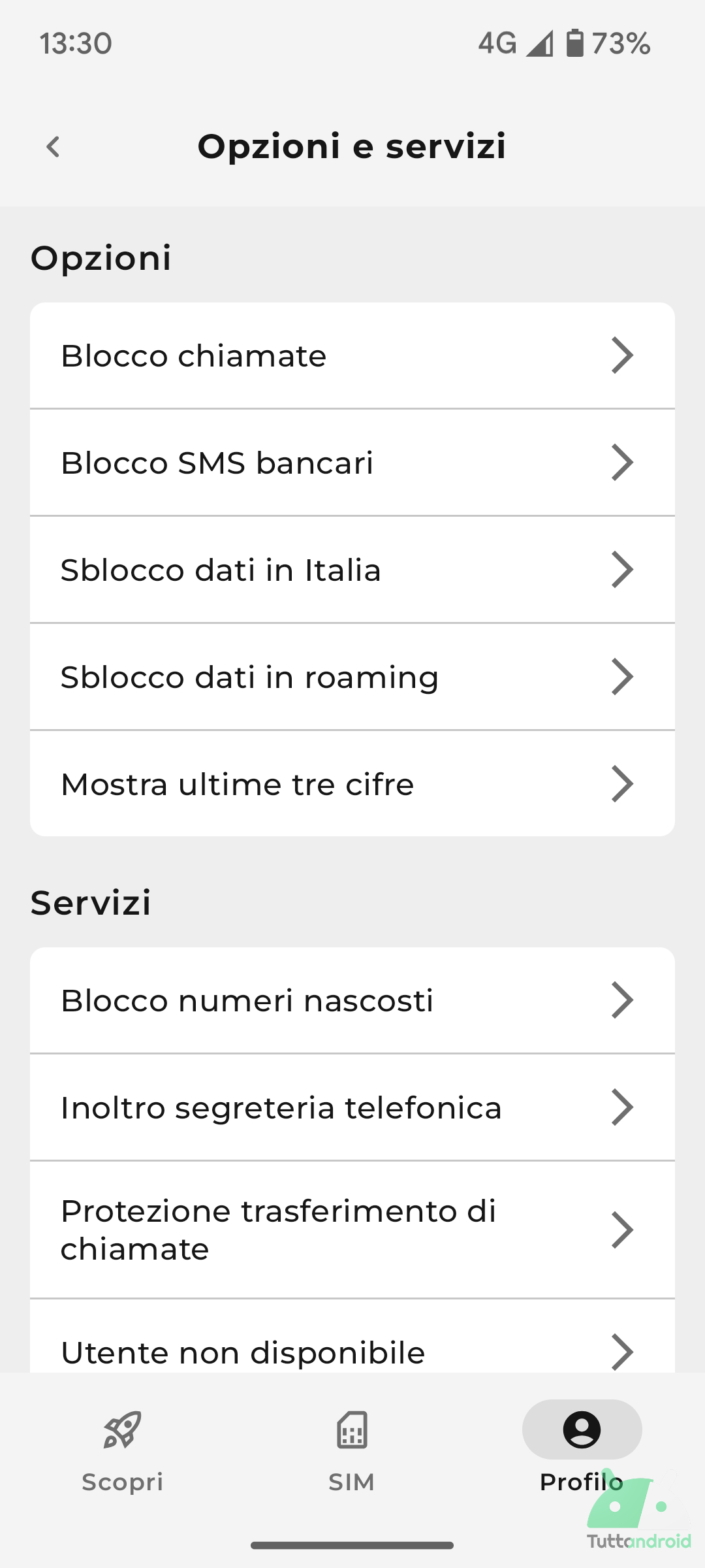La sezione Profilo, invece, contiene i dati dell’account, permette di cambiare la linea telefonica (nel caso in cui abbiate più SIM/eSIM registrate con lo stesso account), consente di personalizzare l’avatar, di gestire i dati personali, i metodi di pagamento, le opzioni e i servizi, contiene l’assistenza e altre informative (quali Termini e condizioni).