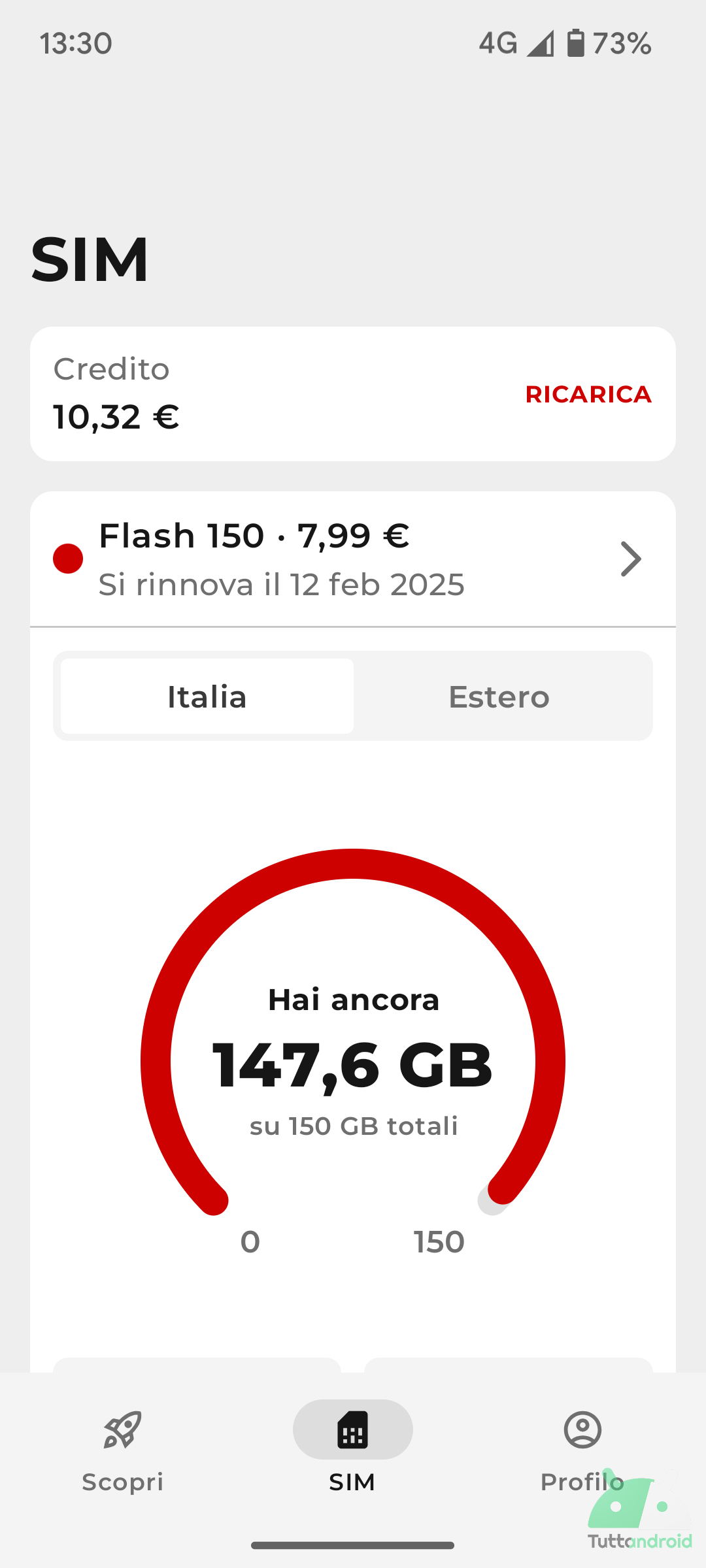 La sezione SIM permette di consultare il credito residuo, il traffico disponibile (con suddivisione tra Italia e Estero) e, più in generale, le metriche collegate alla linea telefonica. Inoltre, è possibile consultare le offerte attive ed effettuare ricariche.