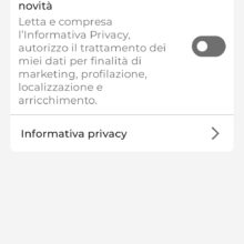 A questo punto, basterà inserire le credenziali di accesso (le stesse con cui siamo registrati all’area personale) prima di effettuare un tap su “Accedi”; la schermata successiva, chiederà di accettare Termini e condizioni (condizioni generali di utilizzo e informativa privacy).