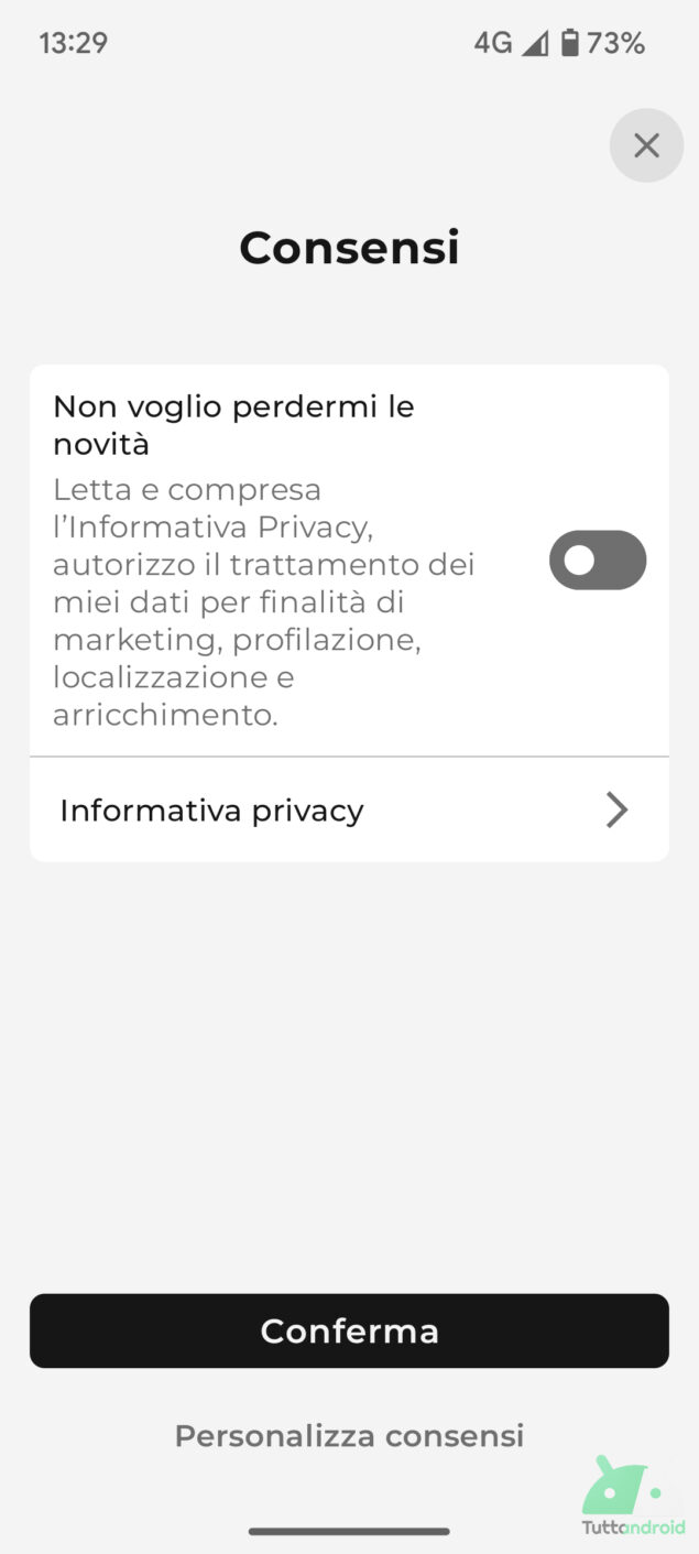 A questo punto, basterà inserire le credenziali di accesso (le stesse con cui siamo registrati all’area personale) prima di effettuare un tap su “Accedi”; la schermata successiva, chiederà di accettare Termini e condizioni (condizioni generali di utilizzo e informativa privacy).