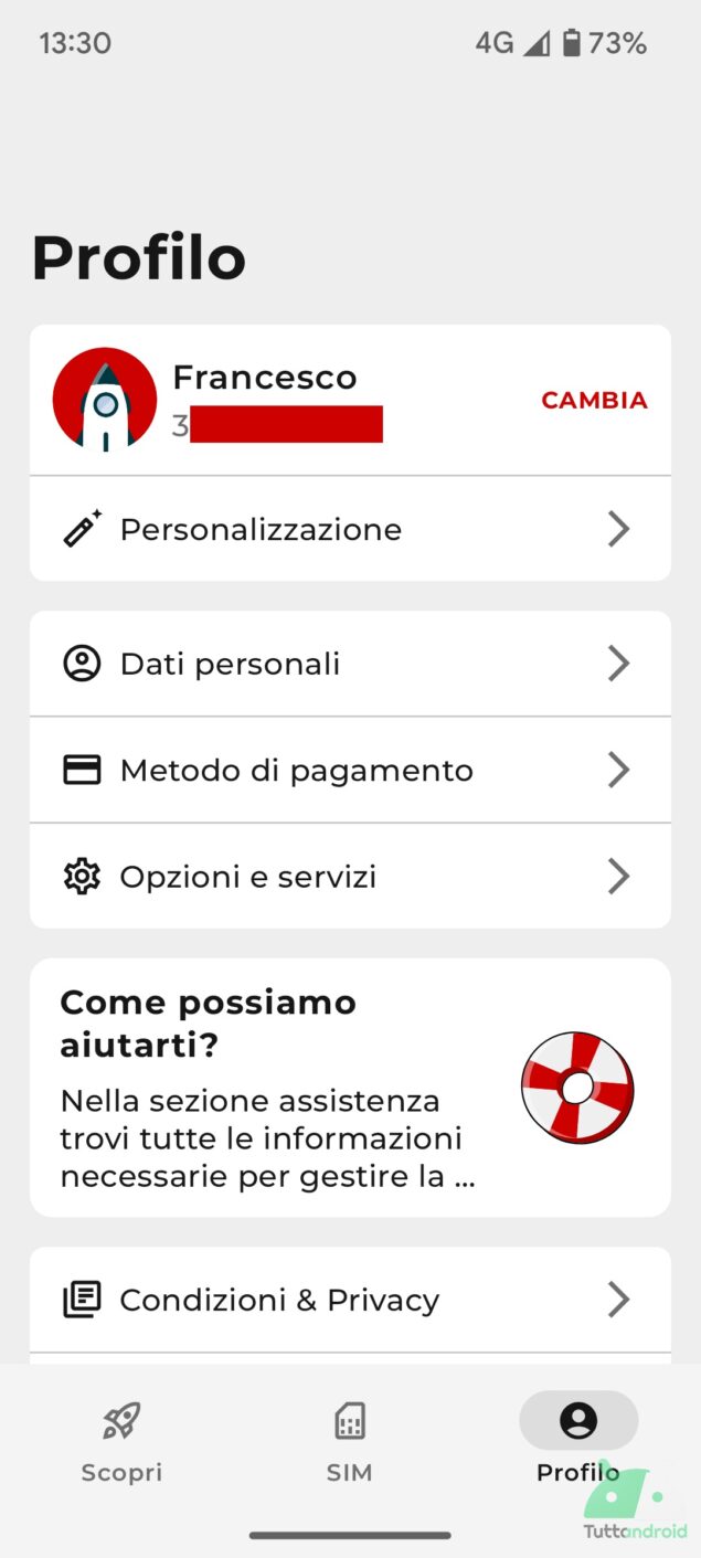 La sezione Profilo, invece, contiene i dati dell’account, permette di cambiare la linea telefonica (nel caso in cui abbiate più SIM/eSIM registrate con lo stesso account), consente di personalizzare l’avatar, di gestire i dati personali, i metodi di pagamento, le opzioni e i servizi, contiene l’assistenza e altre informative (quali Termini e condizioni).