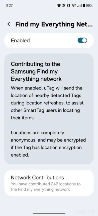 Lo sviluppatore si è spinto oltre, rendendo disponibili appositi widget per visualizzare la posizione dello SmartTag, ma anche la visualizzazione della posizione offline, l’accesso biometrico ed eventualmente l’esportazione della cronologia delle posizioni. L’esperienza è praticamente la stessa offerta con uno smartphone Samsung: è anche possibile contribuire alla rete del produttore per aiutare gli altri a rintracciare i loro dispositivi.