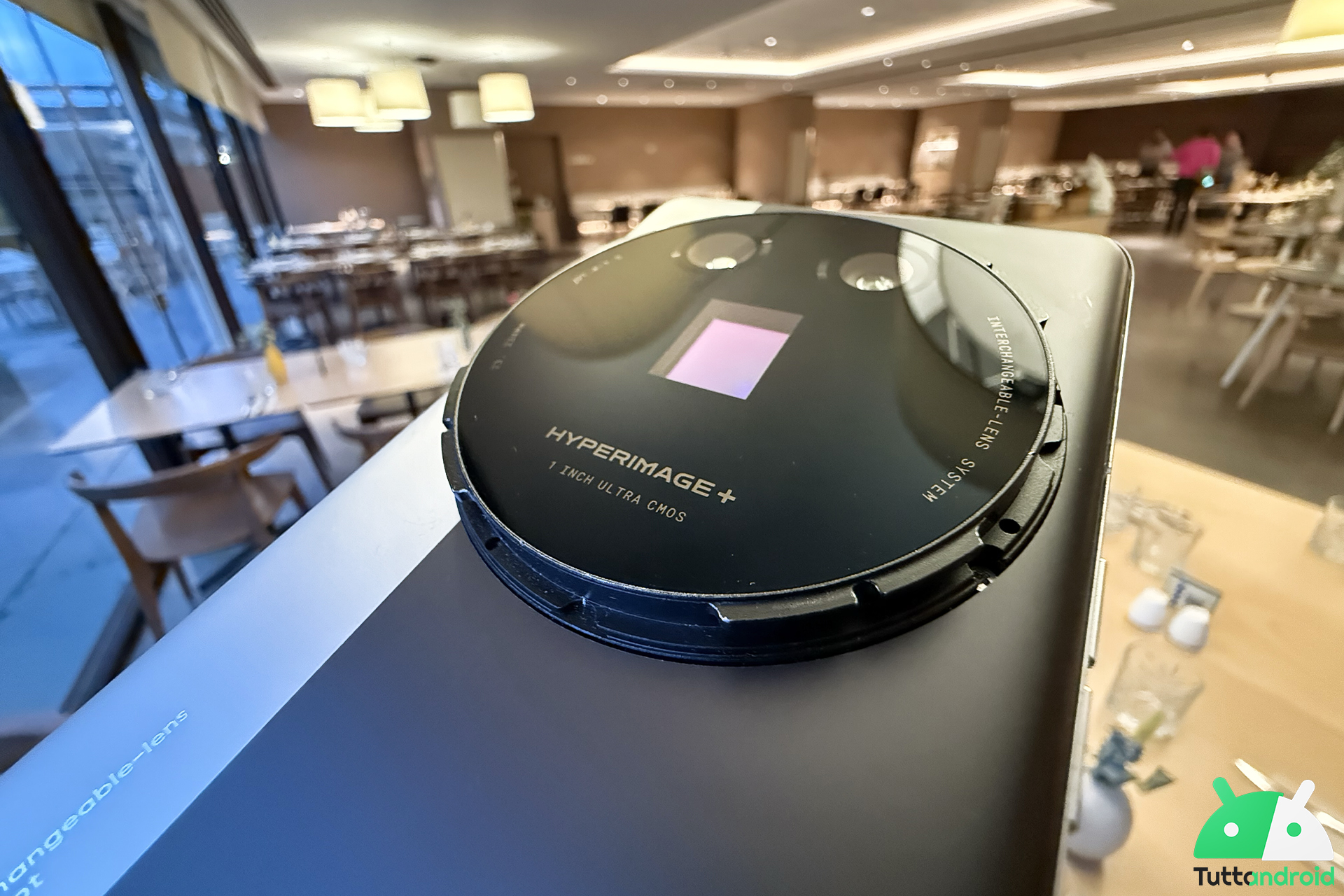 Tutte le sue peculiarità sono ben visibili nella parte posteriore, caratterizzata da un enorme oblò circolare (protetto da vetro), sporgente dalla scocca, che ospita il comparto fotografico. Esso è composto da due “tradizionali” sensori da smartphone (uno grandangolare e uno ultra-grandangolare) e da un sensore CMOS (a luce diretta) rettangolare da 1 pollice targato Sony e potenziato con motore HyperImage+.