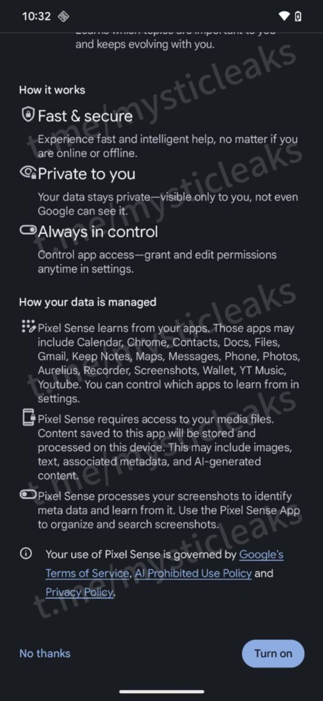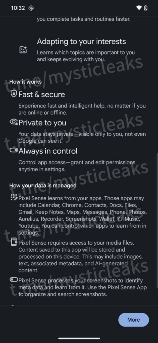 Pixel Sense dovrebbe funzionare completamente sul dispositivo (on device, anche offline) e potrebbe essere basata su Gemini Nano; ciò viene suggerito da altri due script emersi: “Scopri un aiuto rapido e intelligente, non importa se sei online o offline“, “I tuoi dati rimangono privati, visibili solo a te, nemmeno Google può vederli”.