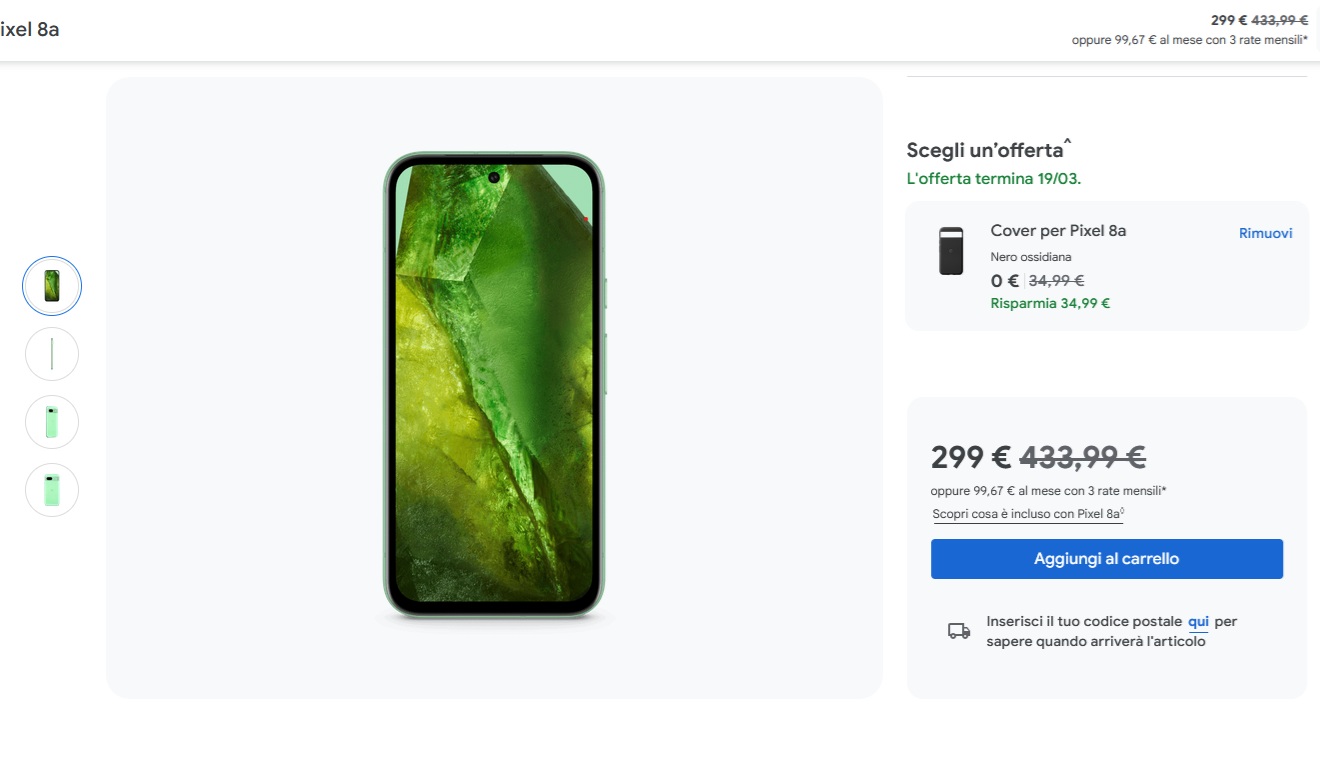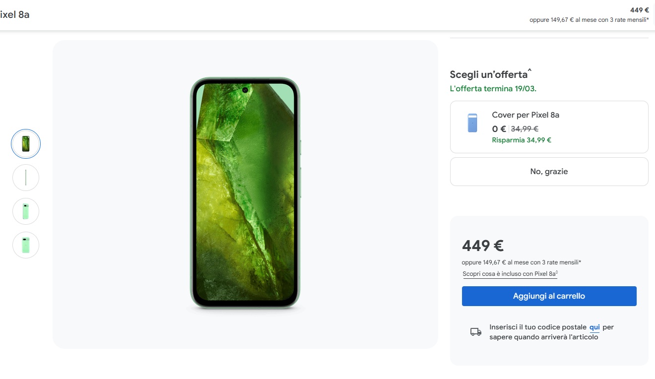 Acquista Google Pixel 8a a 299 euro su Google Store (per avere il prezzo scontato seleziona la cover)