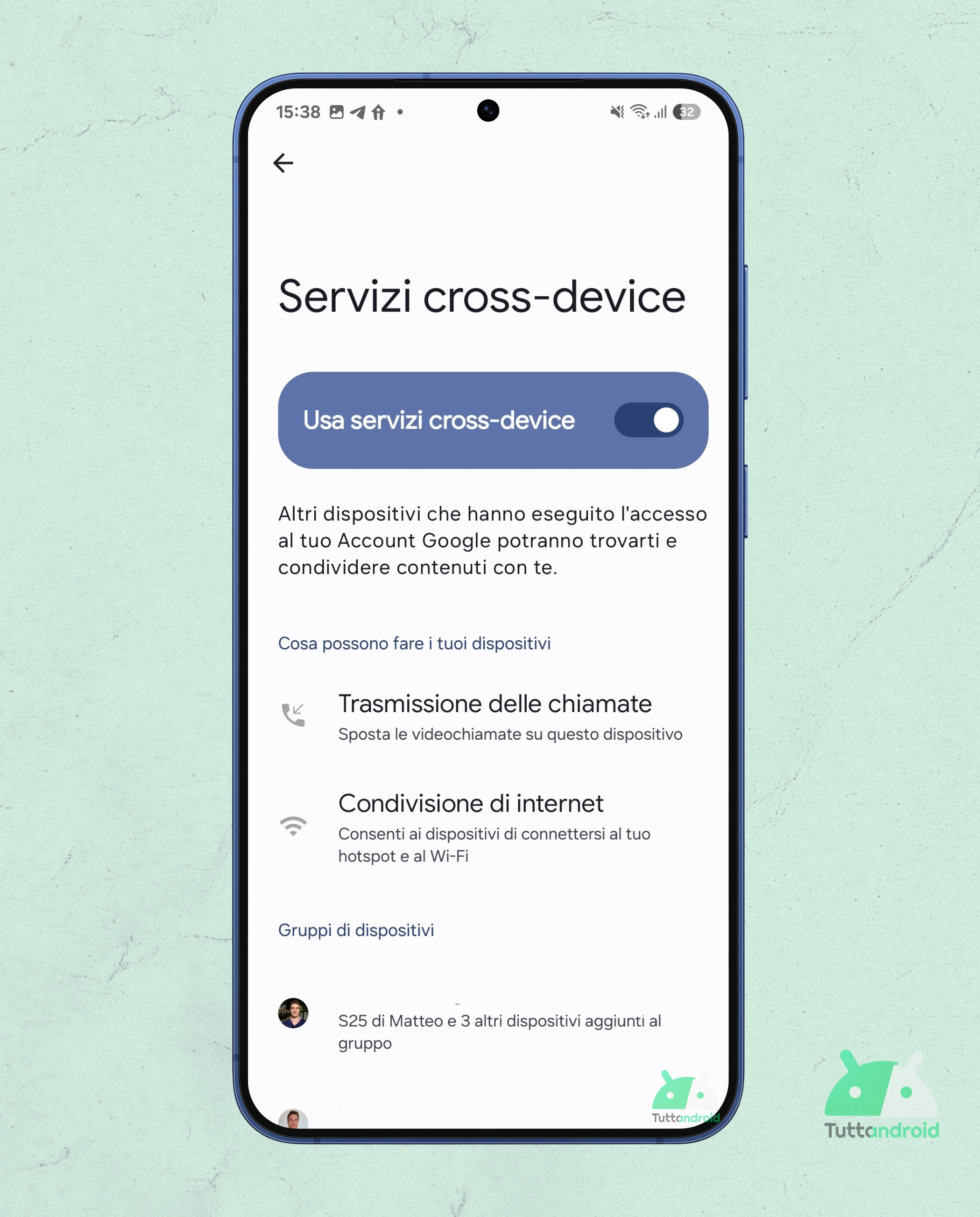 I Samsung Galaxy S25 abbattono questa barriera perché supportano la funzionalità Hotspot istantaneo di Android: essa fa parte dei Servizi Cross-Device (al percorso “Impostazioni > Google > Tutti i servizi > Servizi cross-device“), una suite di funzionalità che migliorano le esperienze “condivise” tra dispositivi Android e fa parte dei Google Play Services.