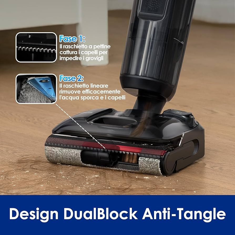 Il nuovo dispositivo per la pulizia dei pavimenti introduce una spazzola innovativa con tecnologia DualBlock Anti-tangle, con due diversi raschietti, uno a pettine che previene la formazione di grovigli e uno lineare che rimuove l’acqua sporca. Si conferma il punto di forza della linea, ovvero la capacità di operare a 180°, consentendo una pulizia completa anche sotto mobili bassi (fino a 13 cm da terra), per una rimozione ottimale di sporco e polvere.