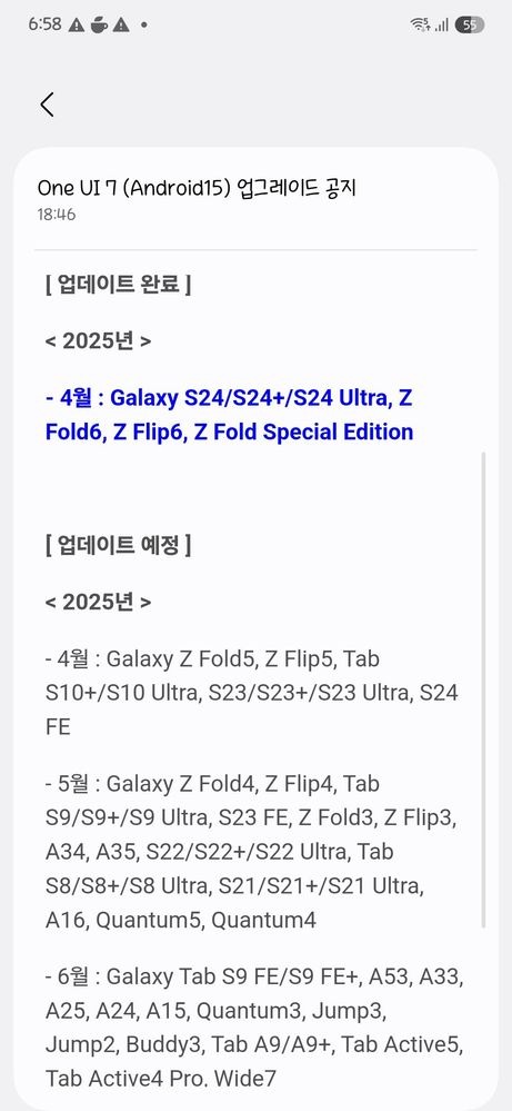 - giugno 2025: Galaxy Tab S9 FE, Galaxy Tab S9 FE+, Galaxy A53, Galaxy A33, Galaxy A25, Galaxy A24, Galaxy A15, Galaxy Quantum 3, Galaxy Jump 3, Galaxy Jump 2, Galaxy Buddy 3, Galaxy Tab A9, Galaxy Tab A9+, Galaxy Tab Active 5, Galaxy Tab Active 4 Pro e Galaxy Wide 7
