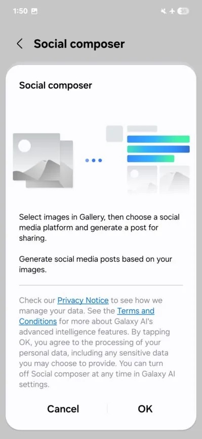 Come probabilmente saprete, gli smartphone e i tablet Samsung con Galaxy AI includono anche da noi l’Assistente alla scrittura, con strumenti pensati per aiutare a comporre, organizzare e migliorare i testi, tradurre le chat e ricevere suggerimenti di risposta per i messaggi. In Cina il produttore sud-coreano si spinge oltre con Social Composer, una funzione capace di generare post sui social media in base alle immagini che si vogliono condividere. Troppo impersonale? Può essere, ma possiamo comunque dargli un’occhiata nelle immagini qui sotto.