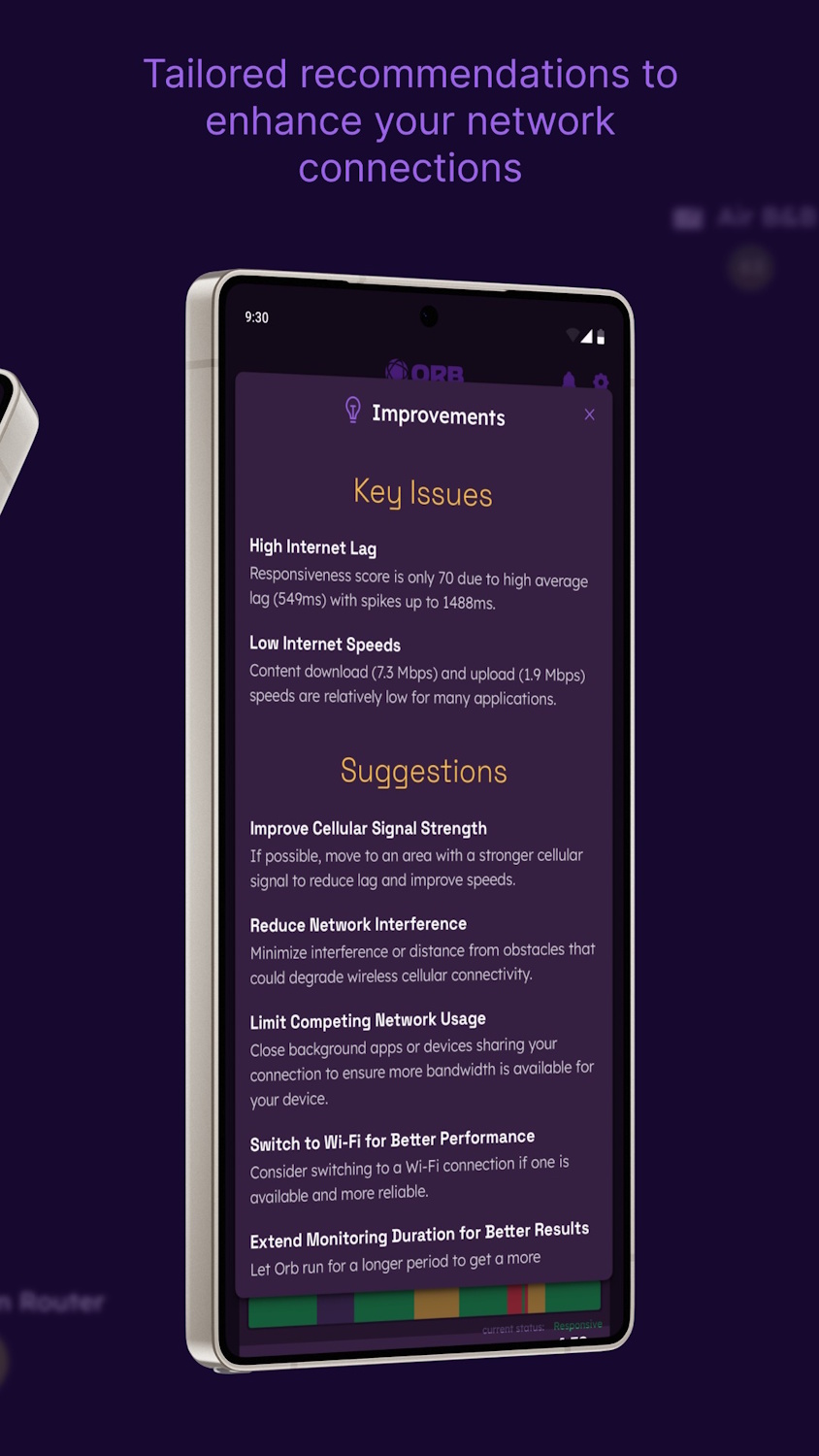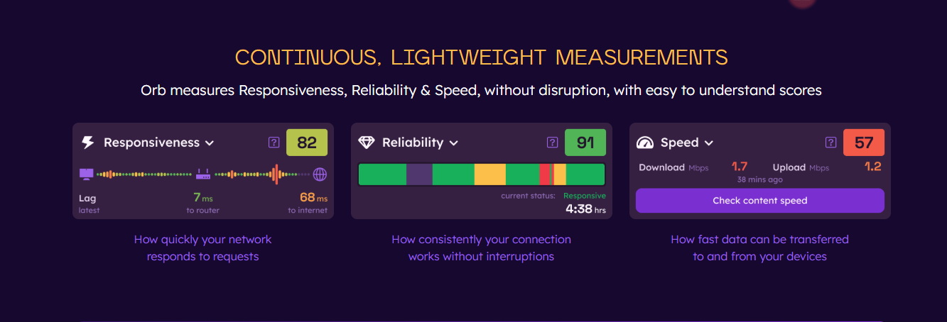 Orb fornisce un punteggio da 1 a 100 per reattività, affidabilità e velocità, che vanno a sommarsi per raggiungere un punteggio complessivo. Nei test di reattività vengono testati latenza, jitter e perdite di pacchetti, in quelli di affidabilità viene testata la costanza nel tempo, mentre in quelli di velocità vengono misurate la velocità di trasmissione in condizioni di normale utilizzo e quella di picco. Se il punteggio complessivo di Orb risulta sotto gli 80 punti su 100, l’app fornisce alcuni consigli basati sull’intelligenza artificiale per apportare miglioramenti alla connessione.