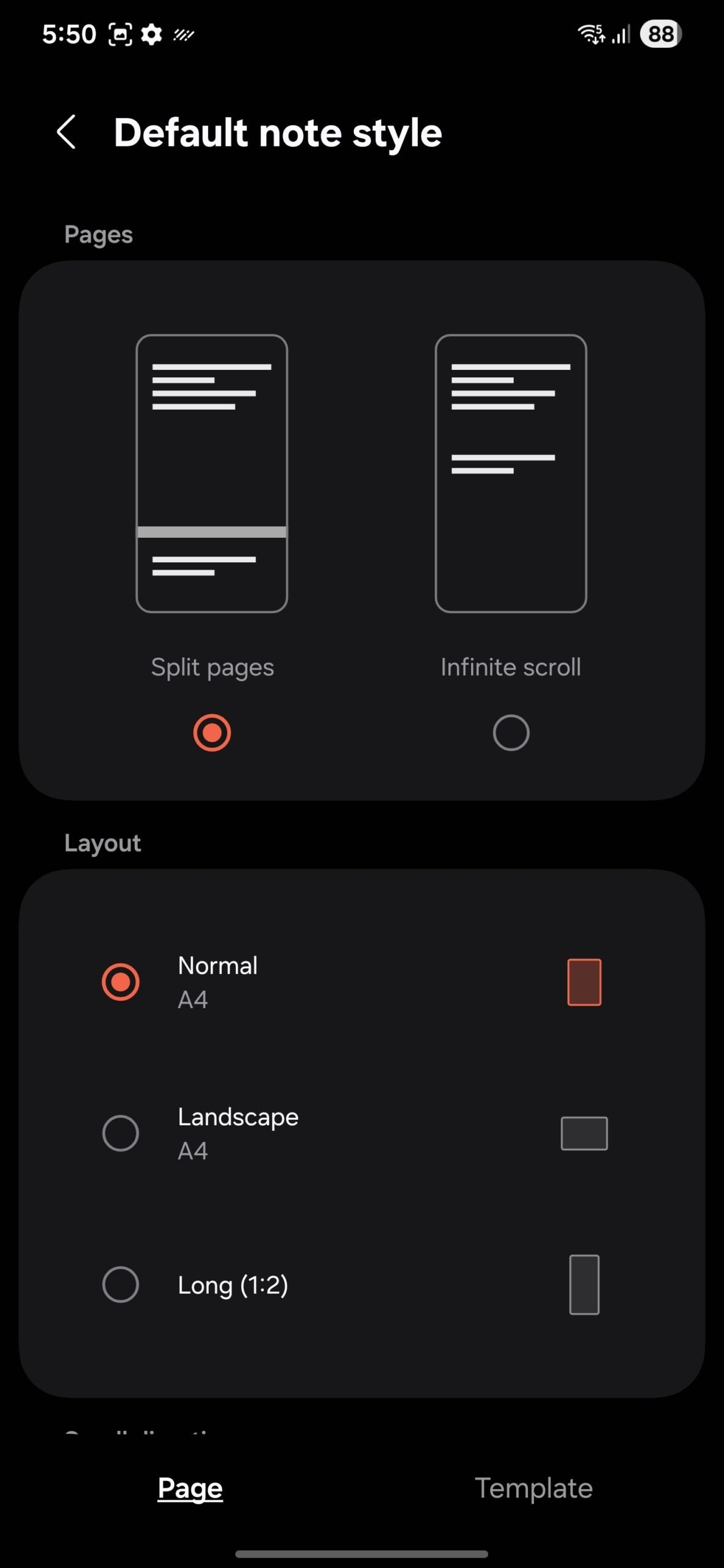 Ci sono modifiche anche nell’interfaccia utente della sezione Stile nota predefinito (accessibile dalle impostazioni generali dell’app): oltre alla possibilità di optare per il layout “Normale” e “Lunga (1:2)”, ora c’è anche “Landscape“. Più in basso resta al suo posto la scelta della Direzione di scorrimento (“Verticale” o “Orizzontale”), ma si aggiunge la scelta del “Colore”: quest’ultima opzione non è una novità vera e propria, ma in precedenza si trovava in una scheda dedicata (la terza dopo “Stile” e “Modello”)