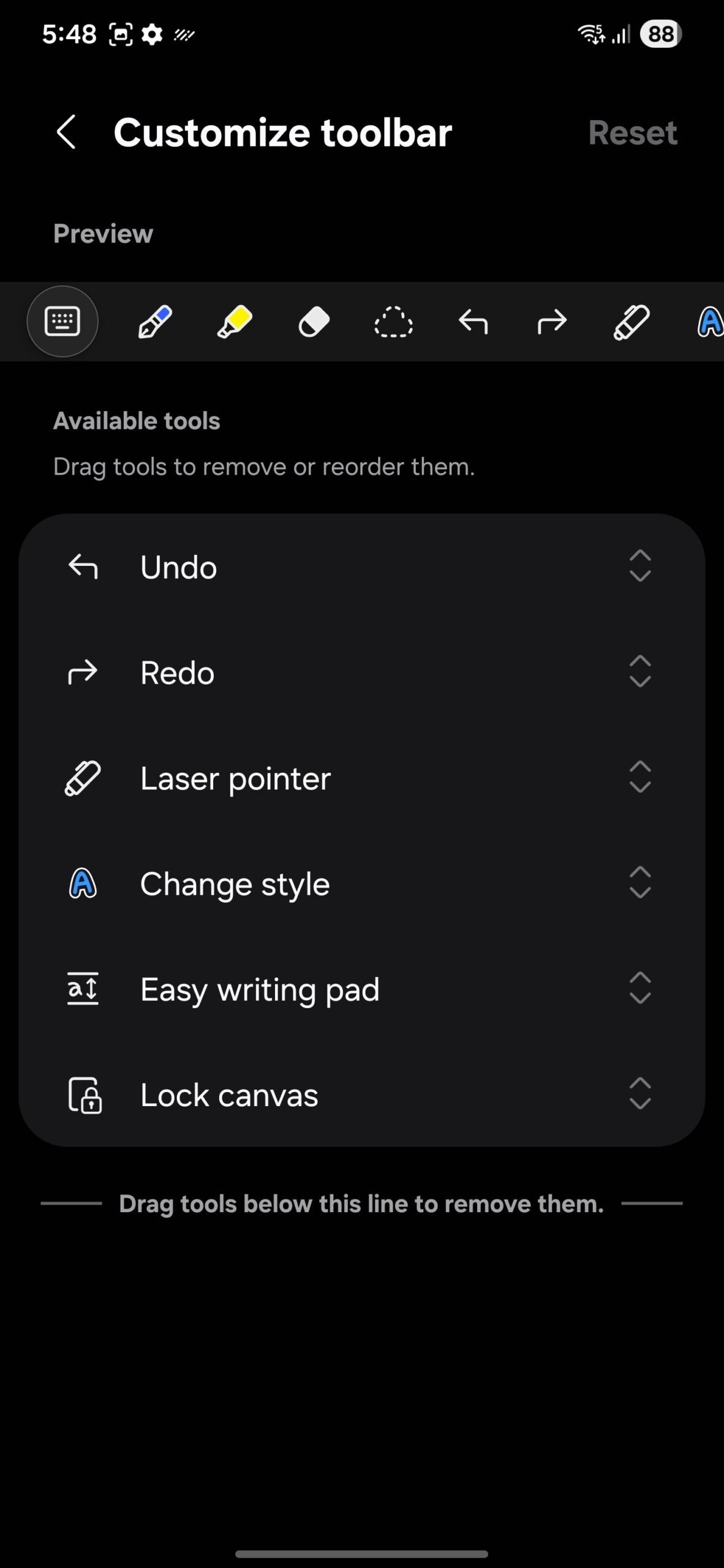 Come potete vedere negli screenshot qui in basso, è stata integrata una barra degli strumenti personalizzabile, che consente di posizionare solamente gli strumenti e i comandi che interessano (tipo di penna, evidenziatore, gomma, funzioni IA, annulla, ripristina, etc. etc.); inoltre, l’app permette ora di scegliere l’ordine degli strumenti tramite un nuovo menu, accessibile tenendo premuto sulla barra degli strumenti stessa.