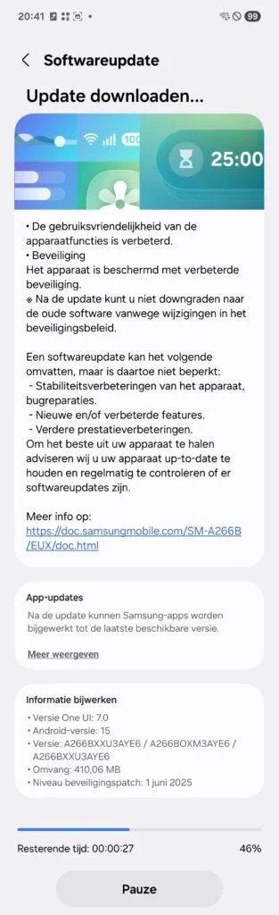 • Per Galaxy A26 5G, la build in distribuzione è la A266BXXU3AYE6 che porta con sé le patch di sicurezza di giugno 2025, utili perché vanno a risolvere dozzine di vulnerabilità (trovate qua il dettaglio).
