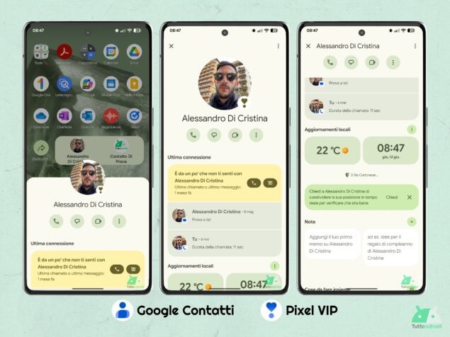 Pixel VIP è molto più di un widget, considerando che va ad arricchire le informazioni messe in mostra nelle schede contatto di Google Contatti ma solo per i contatti etichettati come VIP, quelli ritenuti dall’utente i più importanti. Ecco le funzionalità: