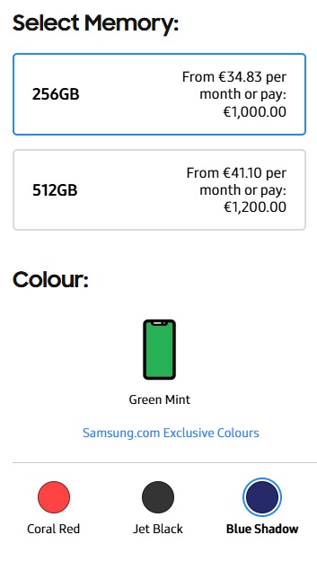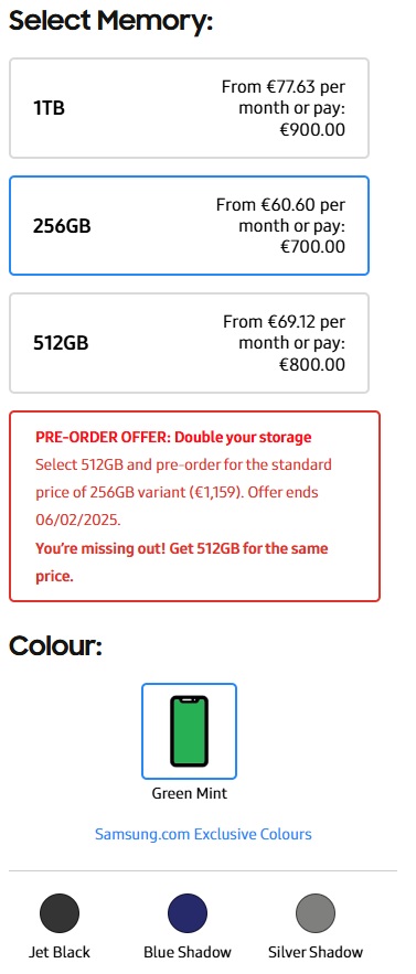 Sul sito irlandese di Samsung sono comparse le pagine prodotto dedicate all’acquisto di Galaxy S Fold7 e Galaxy Z Flip7. Al netto di diverse informazioni palesemente errate (come il prezzo) dettate dal fatto che si tratta di pagine provvisorie, è possibile scoprire quelli che dovrebbero essere i colori e i tagli di memoria di questi due device.