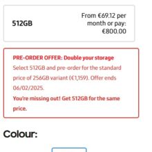 Sul sito irlandese di Samsung sono comparse le pagine prodotto dedicate all’acquisto di Galaxy S Fold7 e Galaxy Z Flip7. Al netto di diverse informazioni palesemente errate (come il prezzo) dettate dal fatto che si tratta di pagine provvisorie, è possibile scoprire quelli che dovrebbero essere i colori e i tagli di memoria di questi due device.