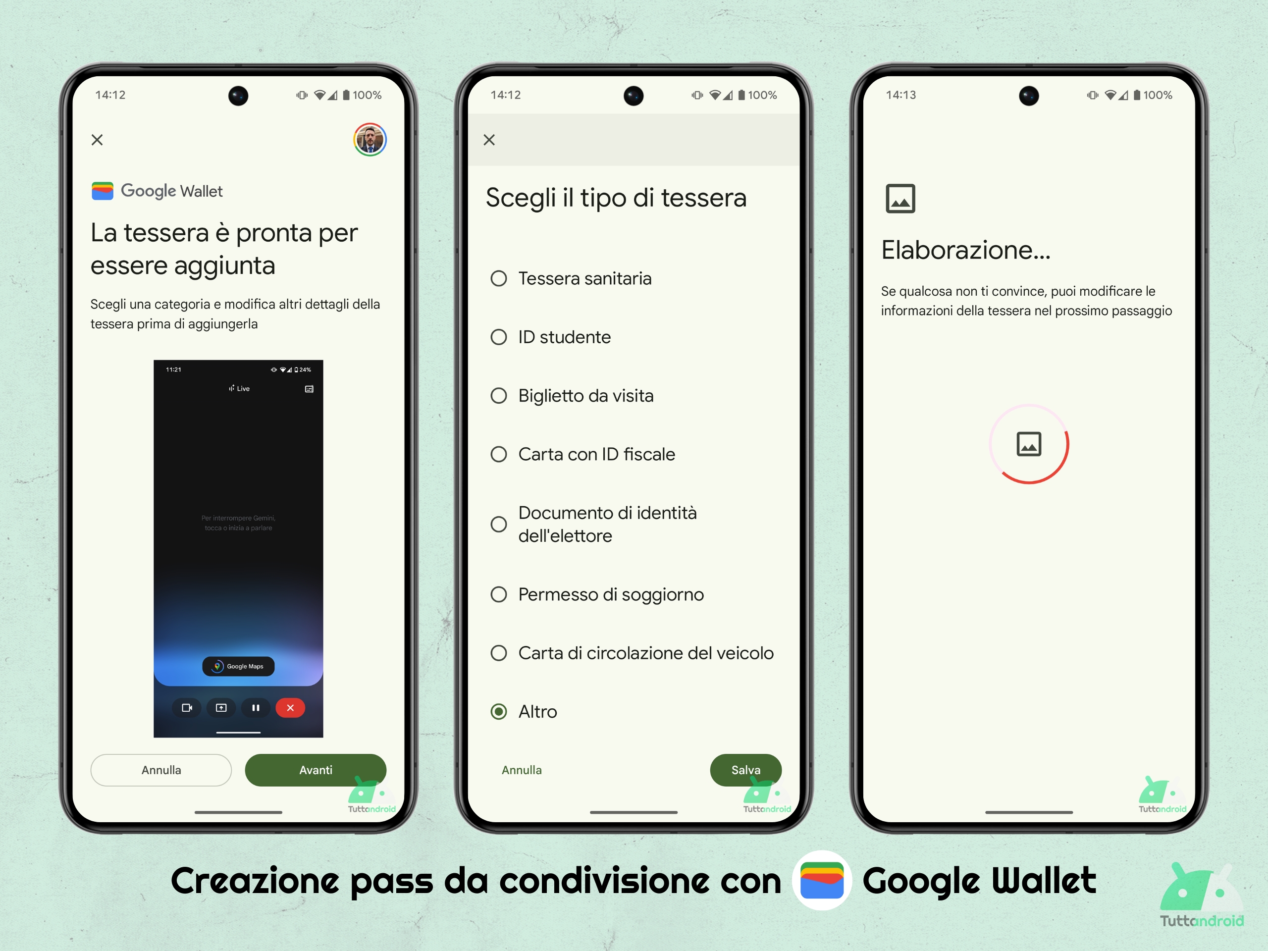 Dal foglio di condivisione che si apre quando selezioniamo un’immagine, basterà effettuare un tap su Google Wallet e selezionare Avanti. A questo punto partirà la procedura di creazione della tessera personalizzata: dovremo selezionare il tipo di tessera da un elenco di opzioni (c’è anche Altro nel caso in cui il pass non soddisfi nessuna delle opzioni proposte) e selezionare Salva. A questo punto partirà il processo di elaborazione.