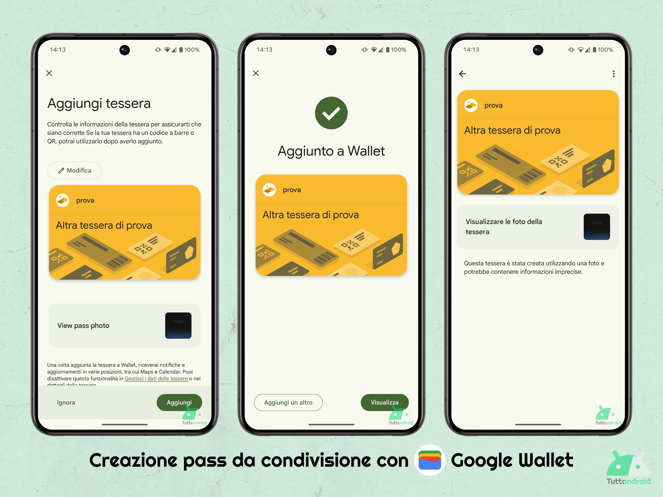 Per facilitare la creazione di un pass (e la aggiunga al portafoglio digitale) a partire da qualsiasi immagine presente in galleria, Google Wallet è stato aggiunto alle opzioni del Foglio di condivisione di Android, quello che compare quando selezioniamo Condividi per inviare a qualcuno un qualsiasi file o una qualsiasi immagine.
