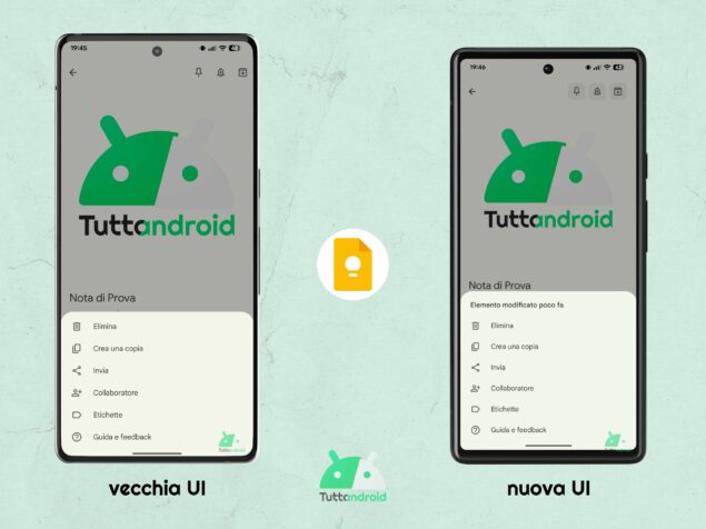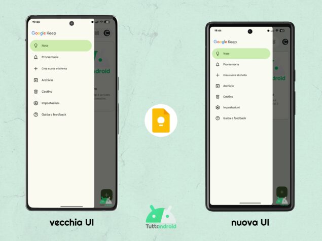 Al termine del caricamento dell’app, sparisce la scritta “Google Keep” e al suo posto compare la dicitura “Cerca su Keep” che ha preso il posto di “Cerca note”. Non cambiano invece le schede delle note, sia nella visualizzazione a colonna singola che nella visualizzazione a più colonne. I più attenti noteranno un maggiore contrasto tra sfondo e singole note. Il menù hamburger rimane lo stesso disponibile in precedenza.