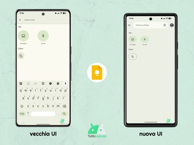 L’ultima differenza è riscontrabile nel menù a cui si accede effettuando un tap sulla barra di ricerca di Google Keep: la schermata non guadagna nuove funzionalità rispetto al passato ma dona criterio agli strumenti disponibili (in questo caso dei tipi di nota o dei colori della nota).
