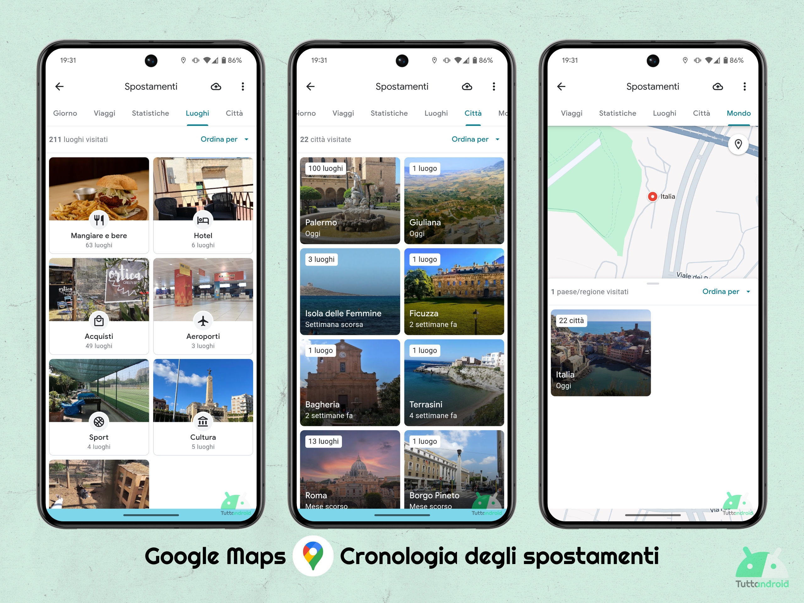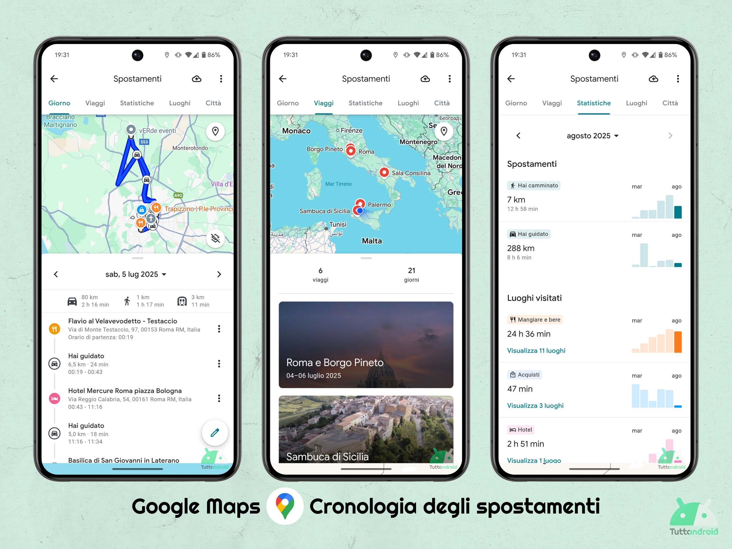 Per utilizzare la Cronologia degli spostamenti, basta effettuare un tap sull’avatar del nostro account Google, selezionare “Spostamenti”, abilitare la funzionalità e iniziare a raccogliere informazioni per i nostri “viaggi nel tempo”.