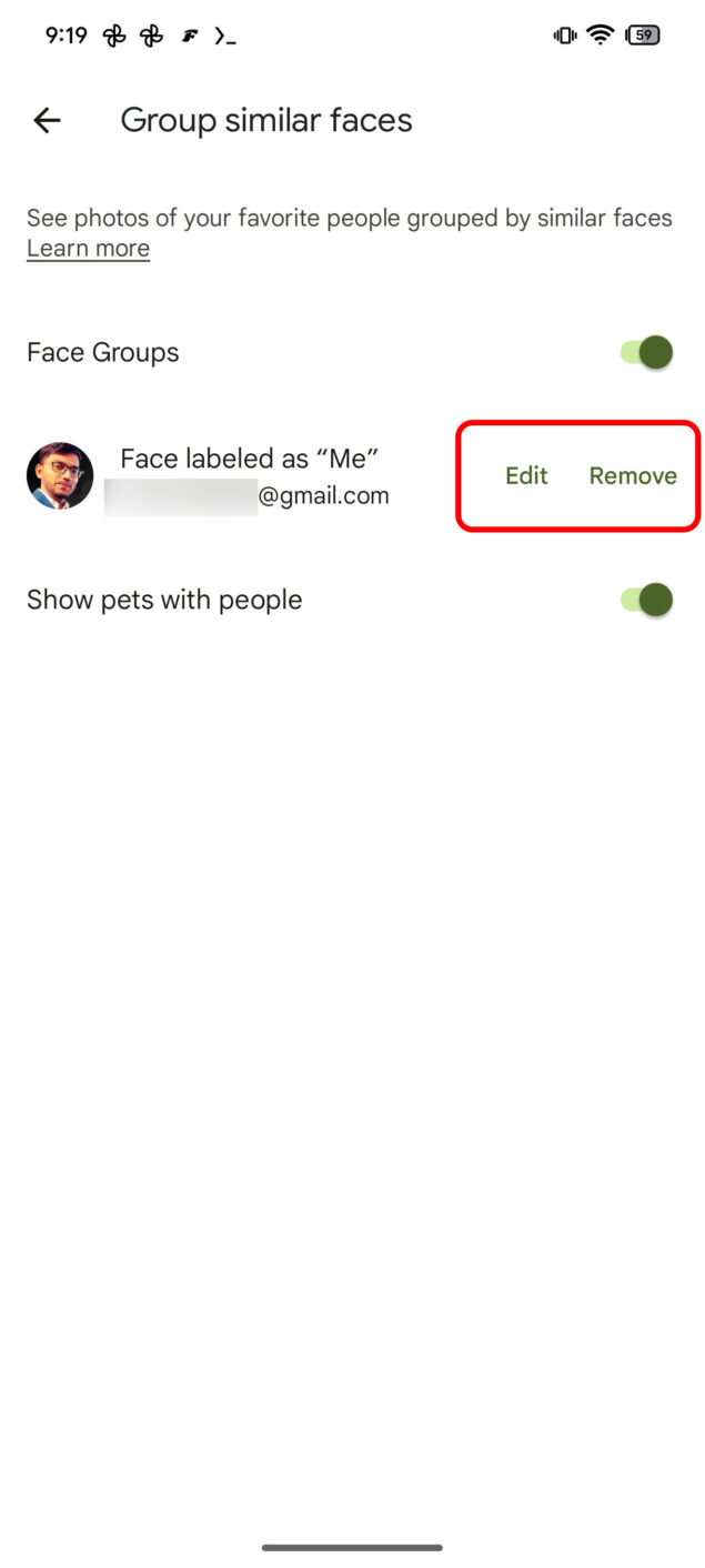 Al percorso “Impostazioni di Foto > Preferenze > Raggruppa volti simili” verrà aggiunta la nuova voce Faccia etichettata come “Me” (con sotto l’indirizzo e-mail associato all’account Google e accanto le opzioni Modifica e Rimuovi.