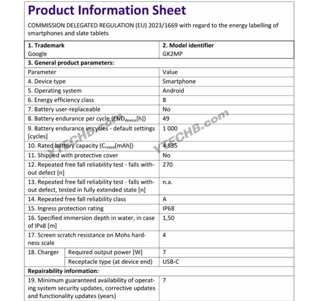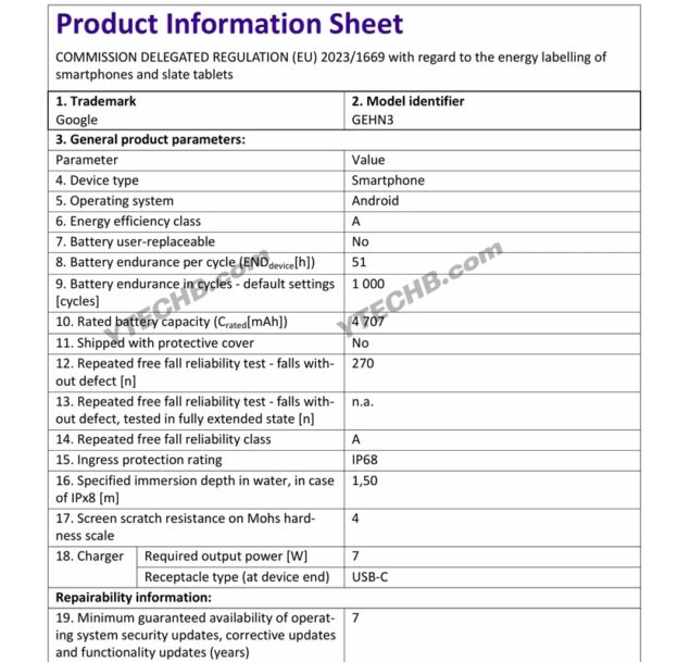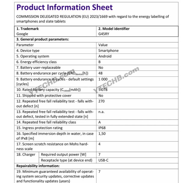 Il portale YTECHB ha recentemente condiviso le immagini delle etichette energetiche e alcuni screenshot dal database EPREL dei tre modelli “tradizionali” della gamma Google Pixel 10.