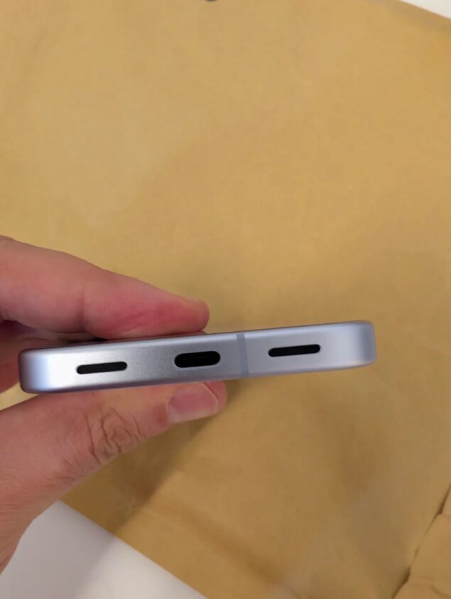 La quarta immagine mostra il lato inferiore dello smartphone: al centro troviamo la porta USB-C, circondata da due feritoie, identiche e disposte simmetricamente ai suoi lati, che ospiteranno lo speaker principale e il microfono principale. L’unico elemento che “rompe” il design altrimenti simmetrico è l’ennesimo intaglio per le antenne.