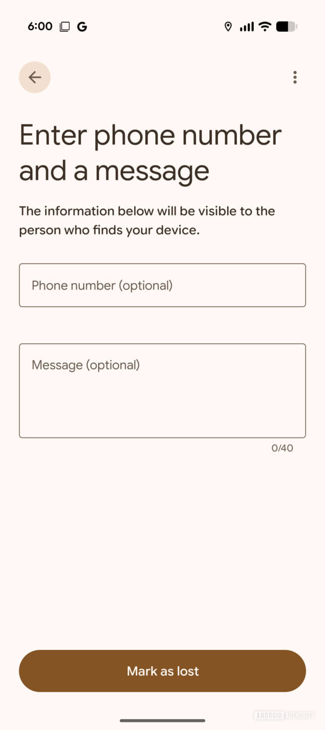La pagina per aggiungere informazioni di contatto (seconda immagine di entrambe le gallerie), opzione che spunta quando contrassegniamo un dispositivo come smarrito, perde l’intestazione in favore di un più eloquente “Inserisci il numero di telefono e un messaggio”, perde l’immagine illustrativa del dispositivo e anche l’indirizzo e-mail associato al nostro account Google.
