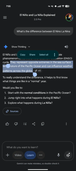 La seconda novità è rappresentata dalla possibilità di evidenziare e copiare direttamente le risposte fornite da Gemini, proprio come si farebbe su una pagina Web (è disponibile l’opzione per selezionare tutto mentre la precedente interfaccia “Seleziona testo” è accessibile attraverso il menu a discesa a tre punti).