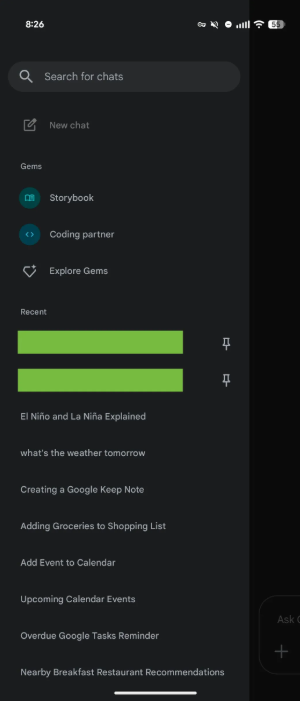Subito sotto la barra di ricerca si trova una scorciatoia per avviare una nuova chat, le due Gems più recenti e un link per esplorare ulteriori contenuti. A seguire quindi viene mostrata la cronologia delle conversazioni recenti, con quelle pinnate in alto e le altre consultabili con un sistema a scorrimento.