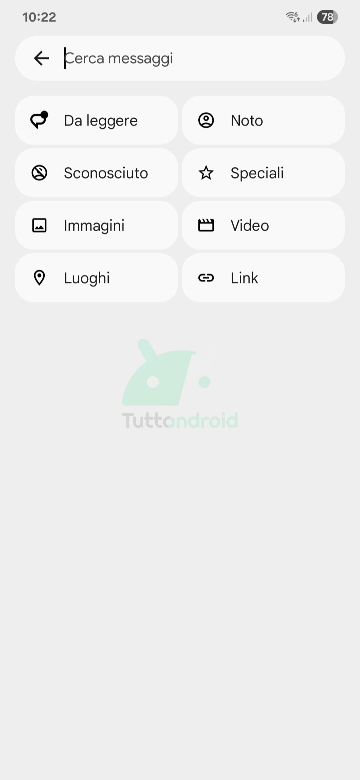 La pagina di ricerca ora mostra una griglia 2×4 con le etichette “Da leggere”, “Noto”, “Sconosciuto”, “Speciali”, “Immagini”, “Video”, “Luoghi” e “Link” per perfezionare e semplificare l’operazione; ciascuna etichetta è inclusa nel suo “contenitore”. Premendo sul pulsante per avviare una nuova chat, si arriva a una schermata rinnovata, che offre i contatti inclusi nei singoli contenitori e un pulsante dedicato alla creazione di gruppi.