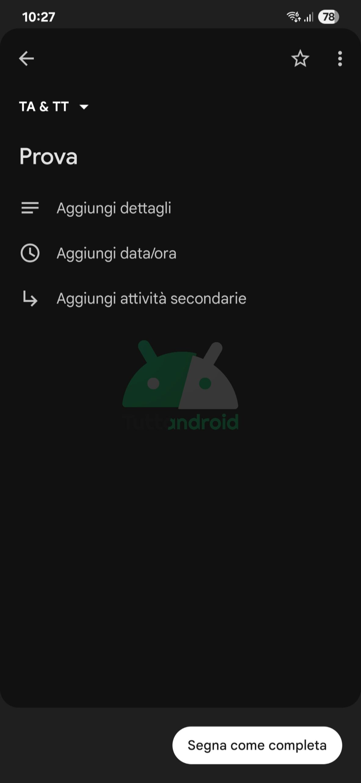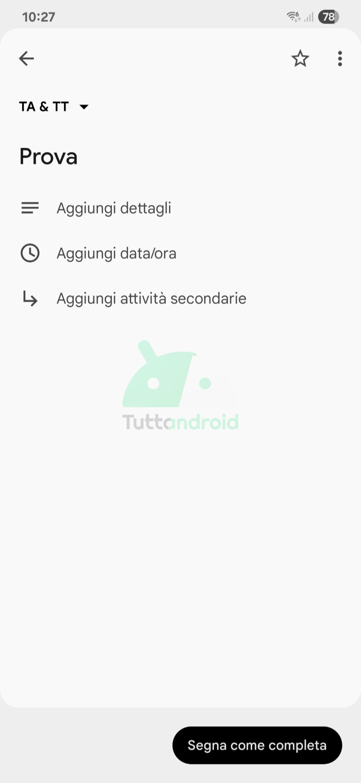 Come potete vedere, ora è presente un “contenitore” che include quasi l’intera schermata dell’attività, dove è possibile trovare tutte le solite voci (“Aggiungi dettagli”, “Aggiungi data/ora”, “Aggiungi attività secondarie” e così via). In più, nella parte inferiore abbiamo un’altra novità: ora il tasto per contrassegnare come completata un’attività è costituito da una pillola che segue il tema del sistema.