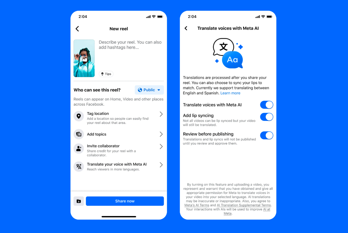 Il colosso dei social network ha precisato che lo strumento Meta AI Translations inizialmente è disponibile per le traduzioni dall’inglese allo spagnolo e dallo spagnolo all’inglese, promettendo il supporto ad altre lingue in futuro.