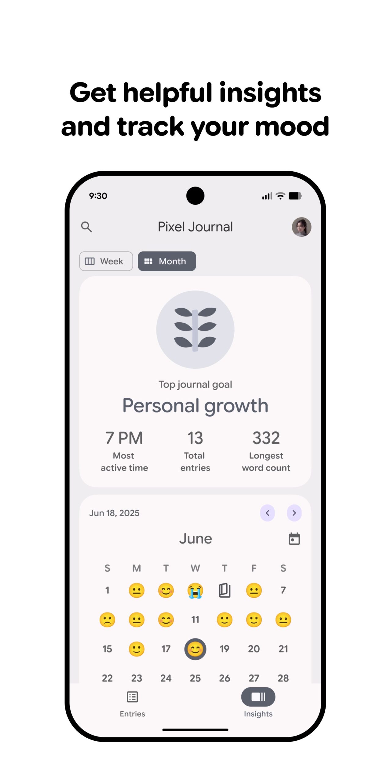 Dal punto di vista funzionale, l’app è suddivisa in due schede: Voci (Entries in inglese) che mostra tutte le “pagine” del diario, incluse le bozze, in ordine cronologico a partire dalla pagina più recente e Approfondimenti (Insights in inglese) che mette insieme i dati legati al diario, tenendo conto dell’andamento settimanale e mensile.