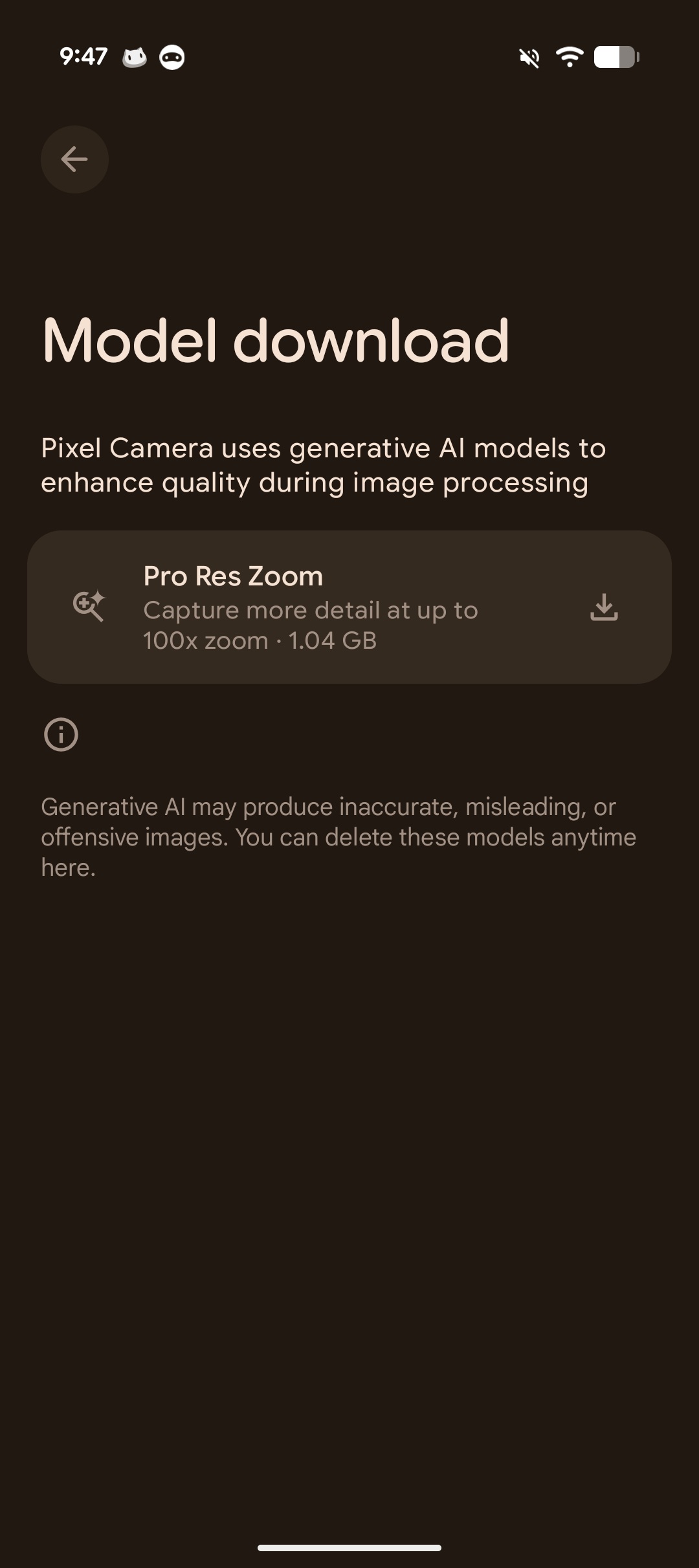 Per sfruttare il nuovo Pro Res Zoom fino al 100x disponibile sui Pixel 10 Pro e Pixel 10 Pro XL, ad esempio, gli utenti dovranno scaricare un “modello” di intelligenza artificiale generativa direttamente dalle impostazioni dell’app Fotocamera Pixel (via TheSpAndroid Blog).