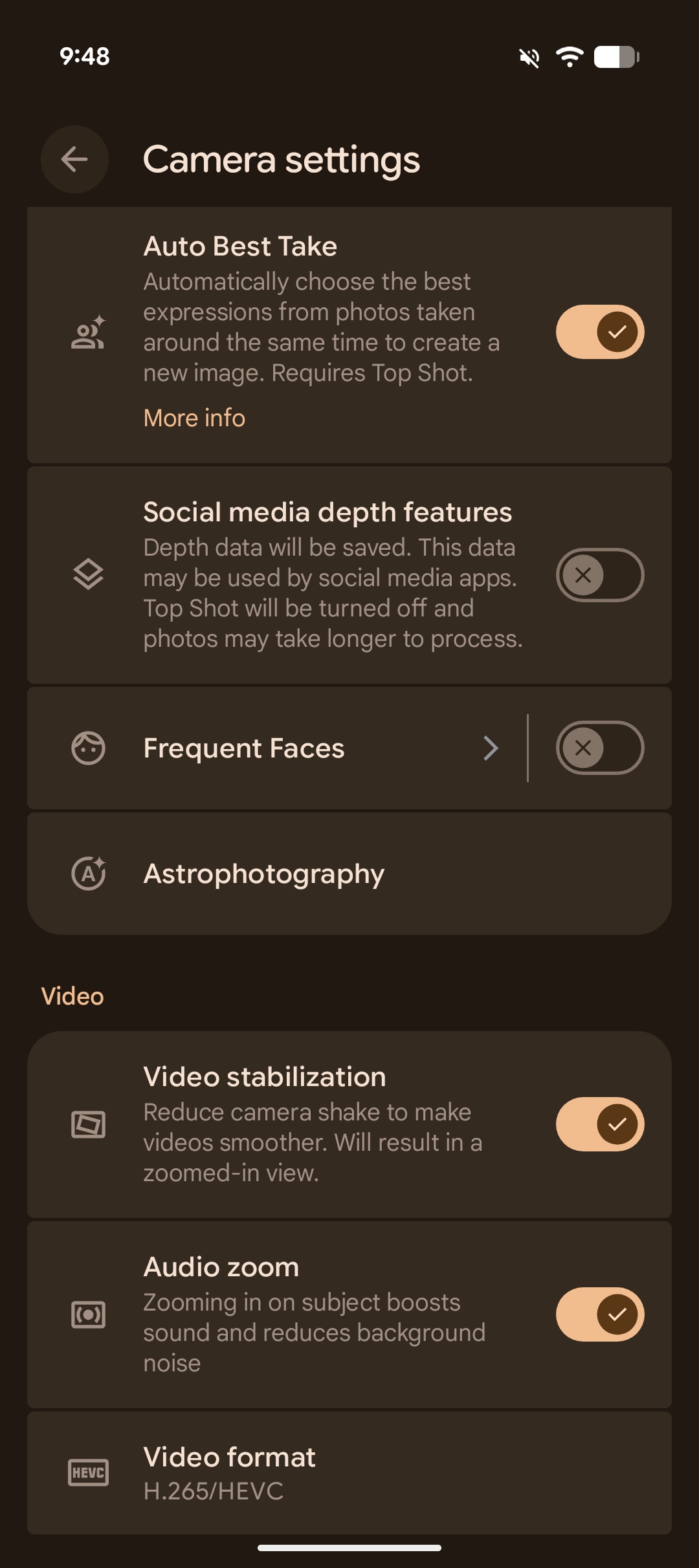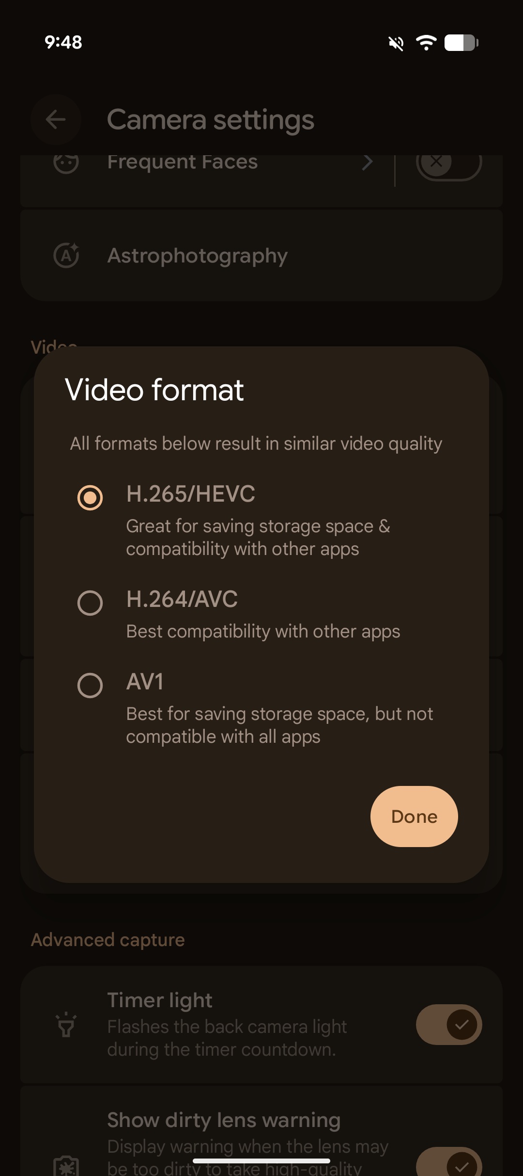 Continuando a scorrere, possiamo notare la presenza della nuova voce Video format che va oltre rispetto al semplice interruttore “Memorizza video efficacemente” disponibile finora che consente di passare dalla codifica H.264/AVC alla codifica H.265/HEVC. Questo perché Big G ha aggiunto la possibilità di registrare video in formato AV1.