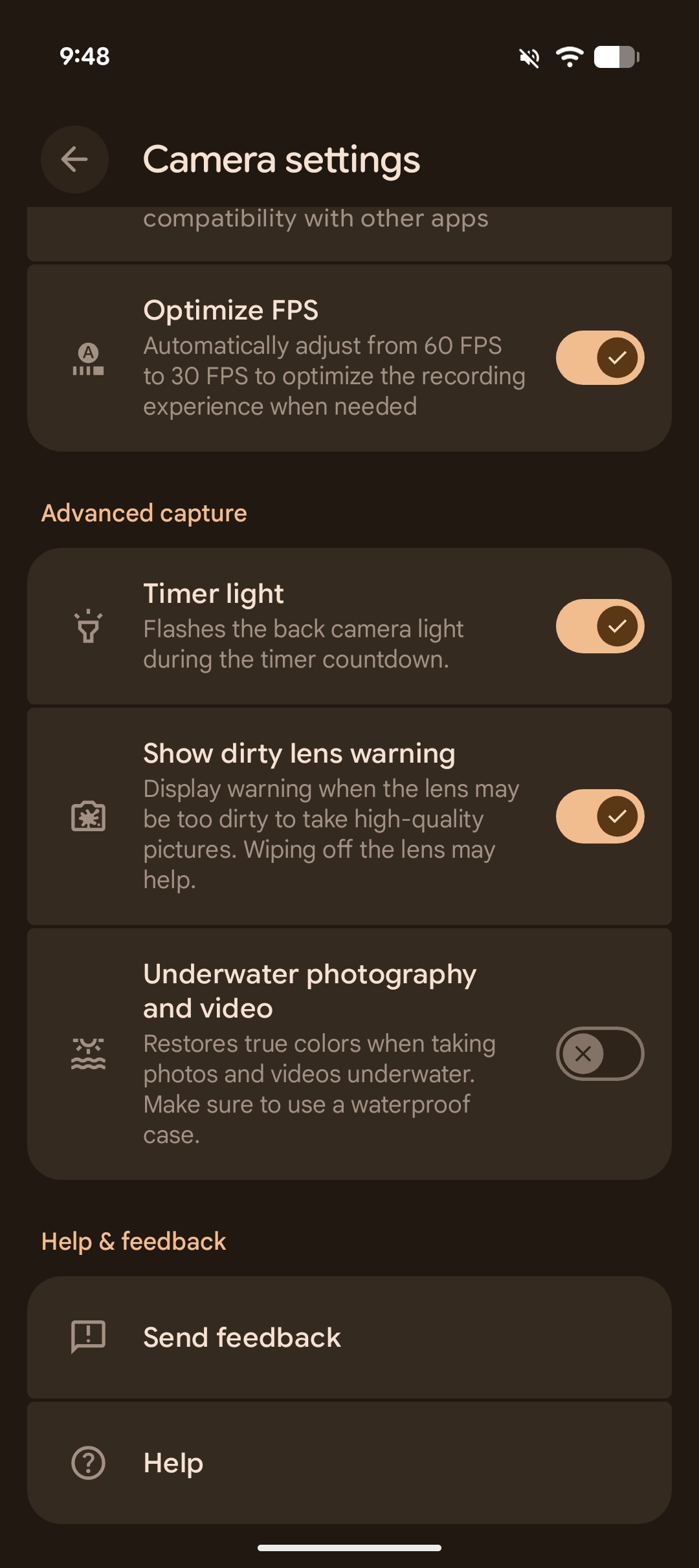 Accedendo alle impostazioni della Fotocamera Pixel, possiamo notare la presenza ancor più vistosa del Material 3 Expressive: le voci rimangono le stesse (tranne la nuova Ottimizza FPS) ma vengono riorganizzate per stare tutte nella stessa pagina.