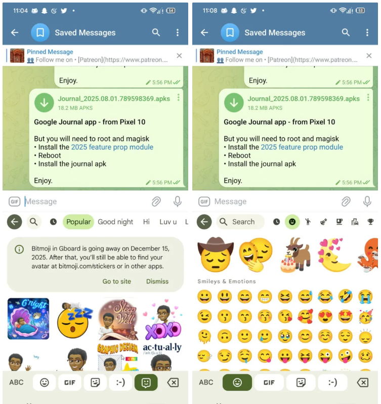 Nell’ultima versione beta di Gboard (15.8.4.793526320-beta-arm64-v8a) è presente un nuovo messaggio (non ancora mostrato di default dall’app) che contiene l’avviso che Bitmoji non sarà più disponibile il 15 dicembre 2025, con la precisazione che dopo quella data gli utenti potranno comunque trovare il proprio avatar su bitmoji.com/stickers o in altre app.