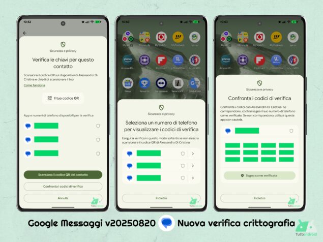 Alternativamente, resta ancora l’opzione Confronta i codici di verifica ma si evolve rispetto al passato: gli utenti potranno controllare la corrispondenza e selezionare “Segna come verificata” per confermare al servizio di sistema di avere effettivamente verificato la corrispondenza dei codici. In questo modo, nel menù precedente, sotto al numero di telefono comparirà la dicitura “Chiavi verificate”.