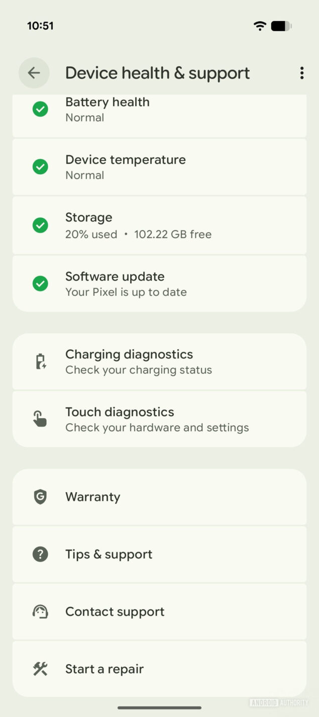 Assieme ai Google Pixel 8, nel 2023, Google ha lanciato una nuova app chiamata Pixel Troubleshooting che fornisce strumenti di diagnostica e risoluzione dei problemi direttamente sul dispositivo. Allo stato attuale, questi strumenti possono essere trovati in due punti delle impostazioni di sistema: