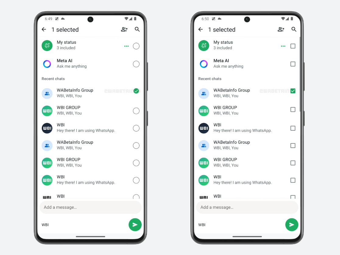 Allo stato attuale il team di WhatsApp sta sperimentando due diverse configurazioni per queste caselle di controllo: una prevede caselle di controllo rotonde (quando vengono toccate, si riempiono per indicare la selezione) mentre l’altra prevede caselle di controllo quadrate, leggermente più grandi e con un aspetto più spigoloso.