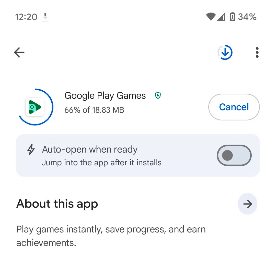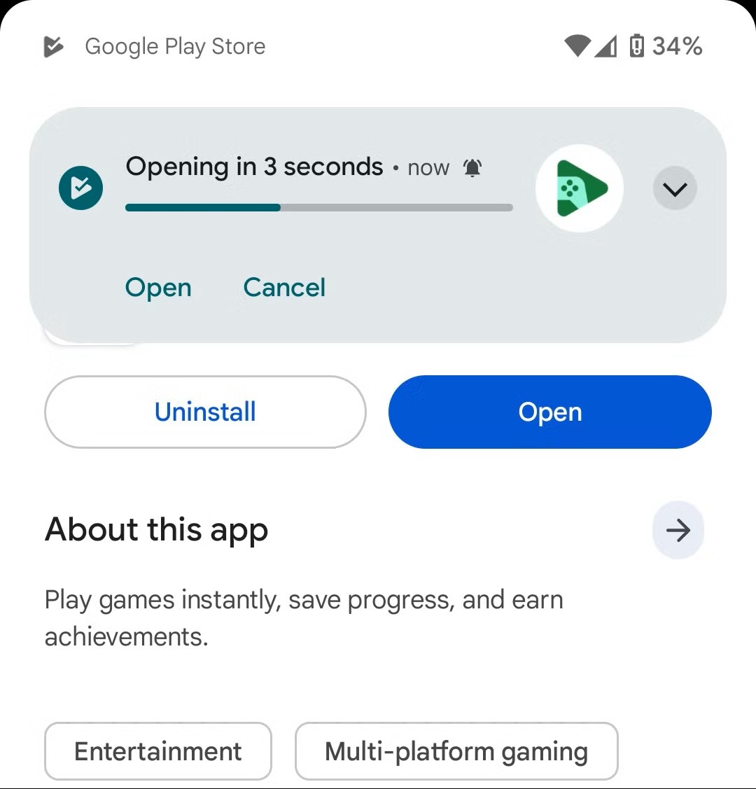 Parallelamente al restyling grafico, Google reintroduce una funzione dedicata all’apertura automatica delle app appena installate. L’opzione, chiamata Auto-open when ready, consente di avviare immediatamente un’app al termine del download. Al termine dell’installazione l’app si apre automaticamente, ma prima viene mostrata una notifica con un conto alla rovescia di cinque secondi. In questo intervallo l’utente può scegliere se confermare l’apertura o annullarla, mantenendo così il pieno controllo sull’avvio.